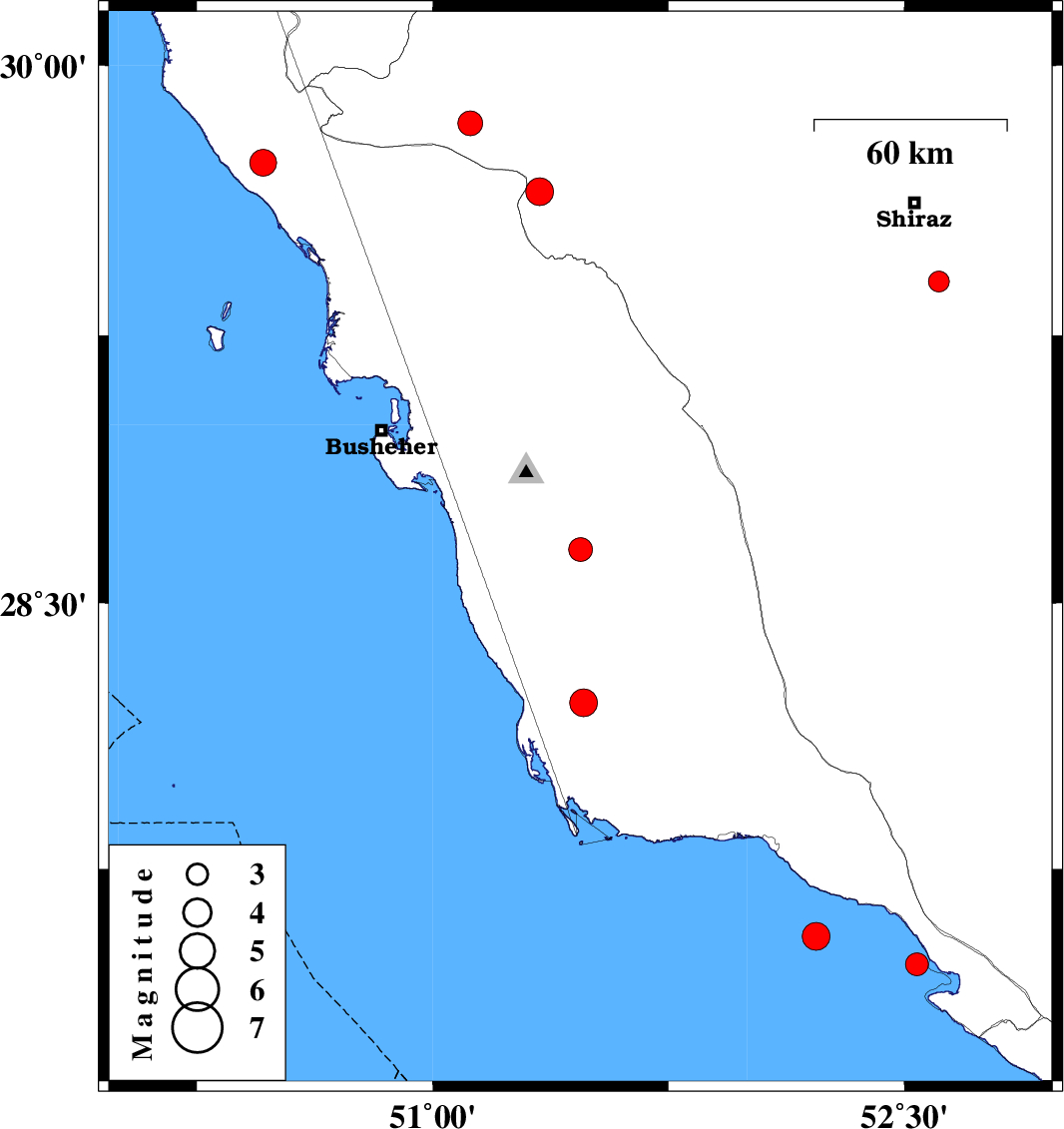 | 2010/02/05 | 05:57:06.6 | 09:27:06.6 | 27.56 | 52.22 | 7 | ML:3.9 | Persian Gulf, 32 km South of Jam | ||