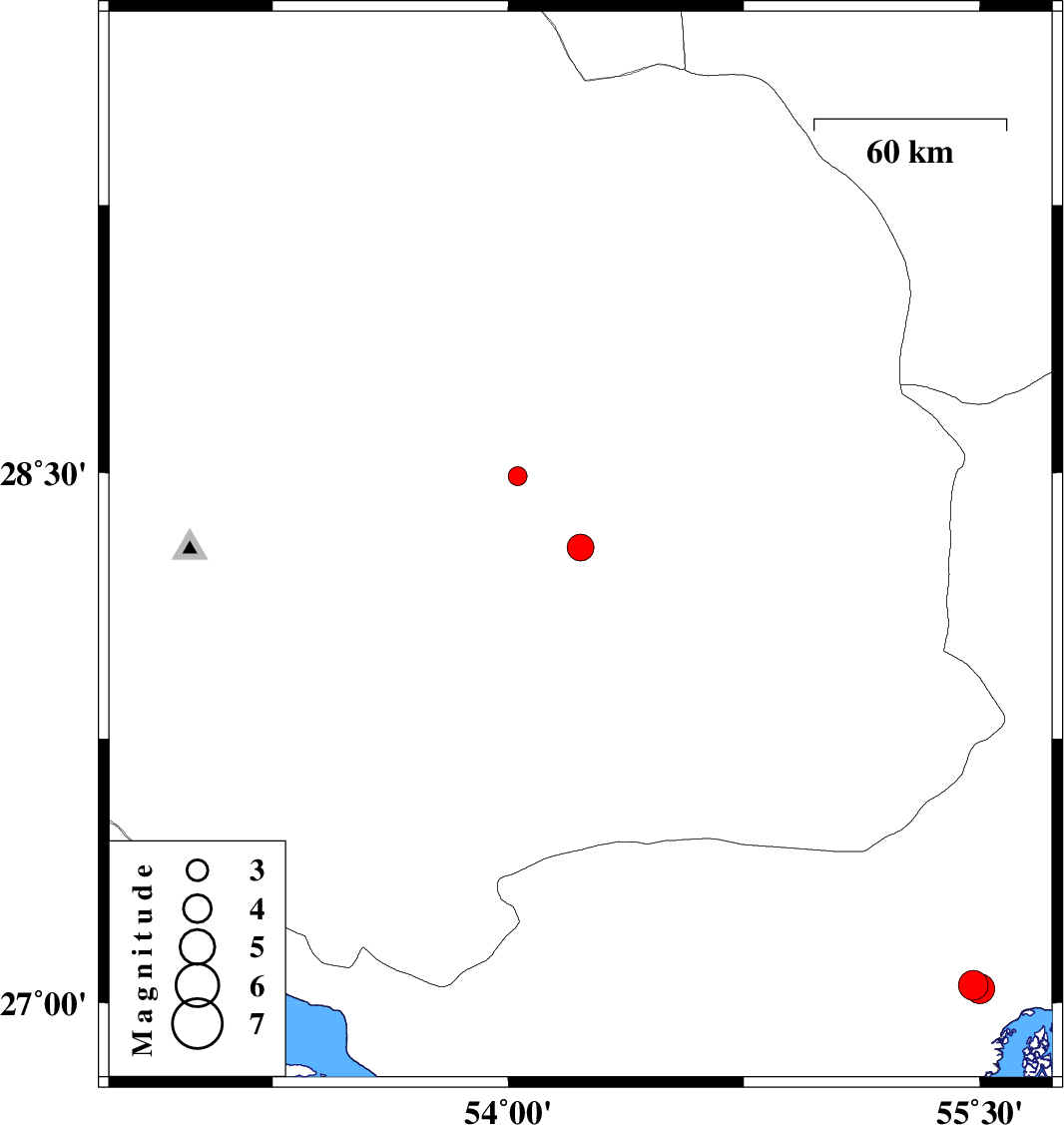 | 2010/01/10 | 15:20:33.2 | 18:50:33.2 | 27.04 | 55.5 | 17 | ML:4.2 | 76 km West of Qeshm, Hormozgan Province |