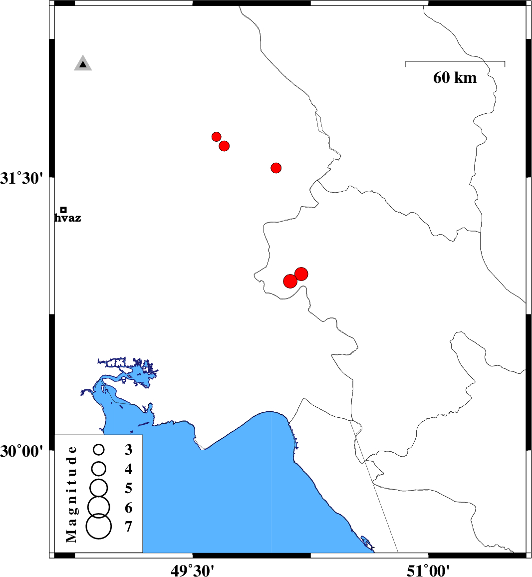 | 2010/02/11 | 21:07:52.6 | 00:37:52.6 | 30.93 | 50.12 | 15 | ML:3.9 | 39 km North-West of Behbahan, Khoozestan Province | ||
