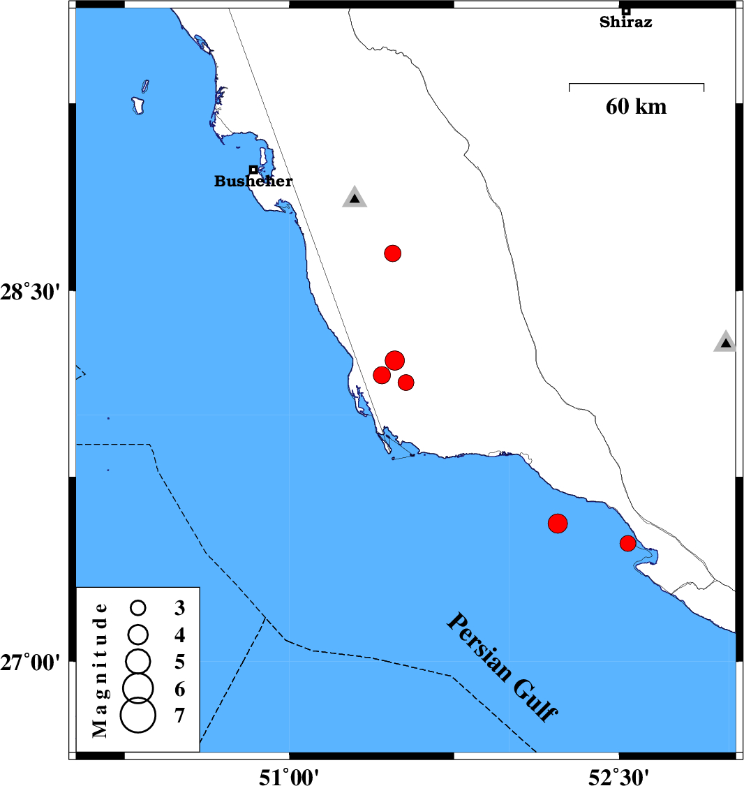 | 2010/02/04 | 23:40:08.6 | 03:10:08.6 | 27.48 | 52.54 | 20 | ML:3.3 | Persian Gulf, 35 km West of Mehr | ||