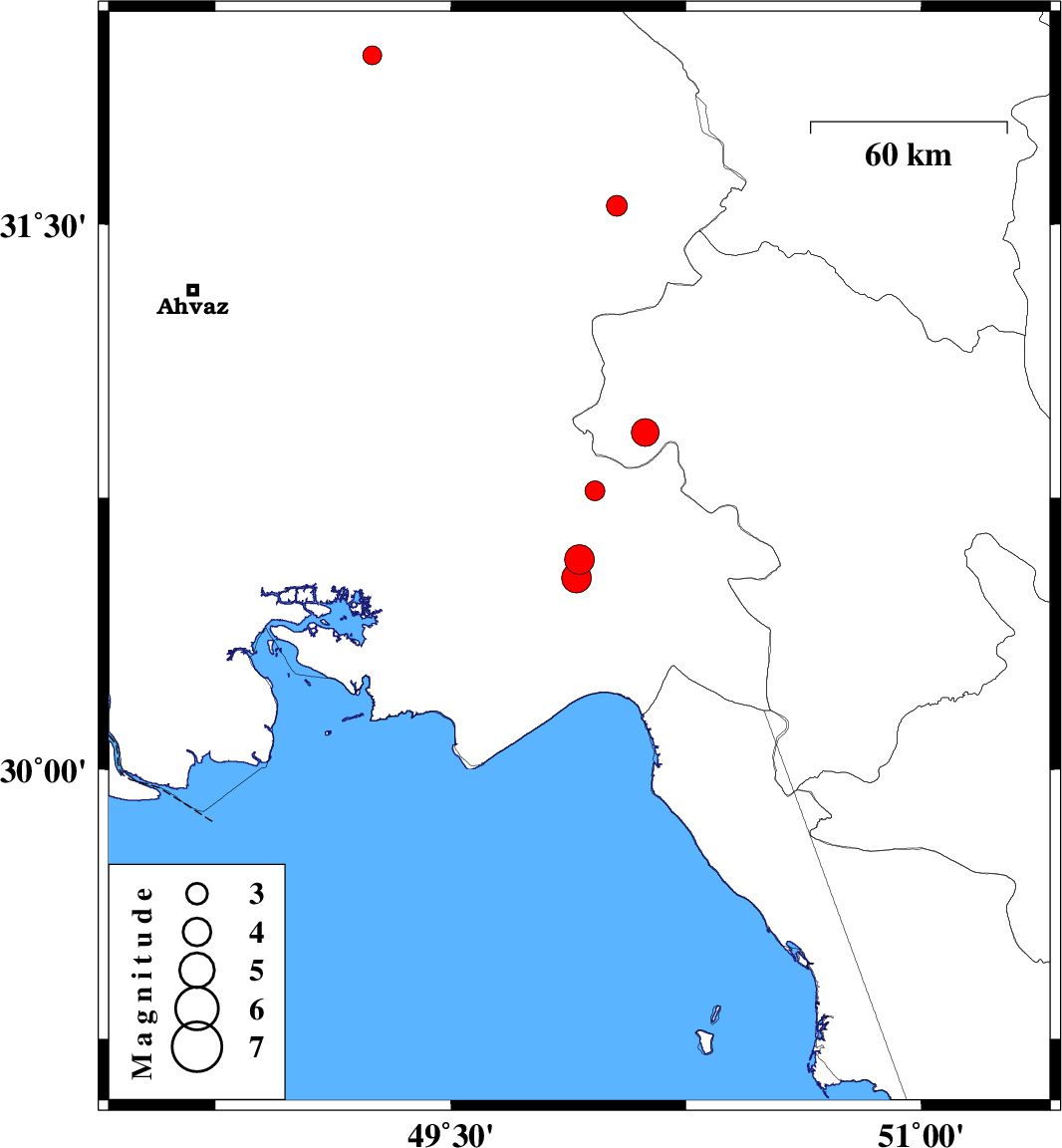 | 2010/02/14 | 03:26:47.2 | 06:56:47.2 | 30.58 | 49.91 | 43 | ML:4.2 | 28 km South-East of Omidiyeh, Khoozestan Province | ||