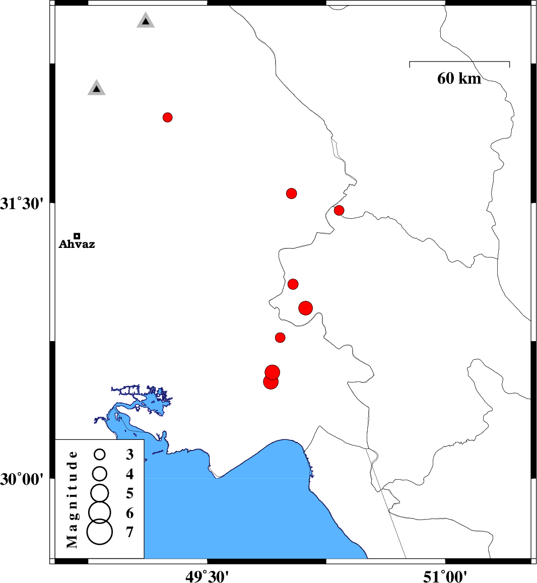 | 2010/02/14 | 03:26:47.2 | 06:56:47.2 | 30.58 | 49.91 | 43 | ML:4.2 | 28 km South-East of Omidiyeh, Khoozestan Province | ||
