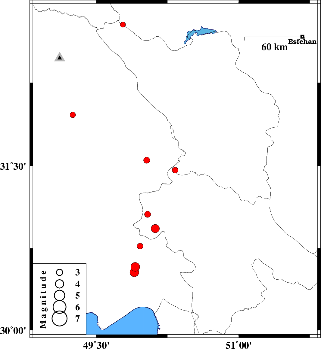 | 2010/02/11 | 21:07:52.6 | 00:37:52.6 | 30.93 | 50.12 | 15 | ML:3.9 | 39 km North-West of Behbahan, Khoozestan Province | ||