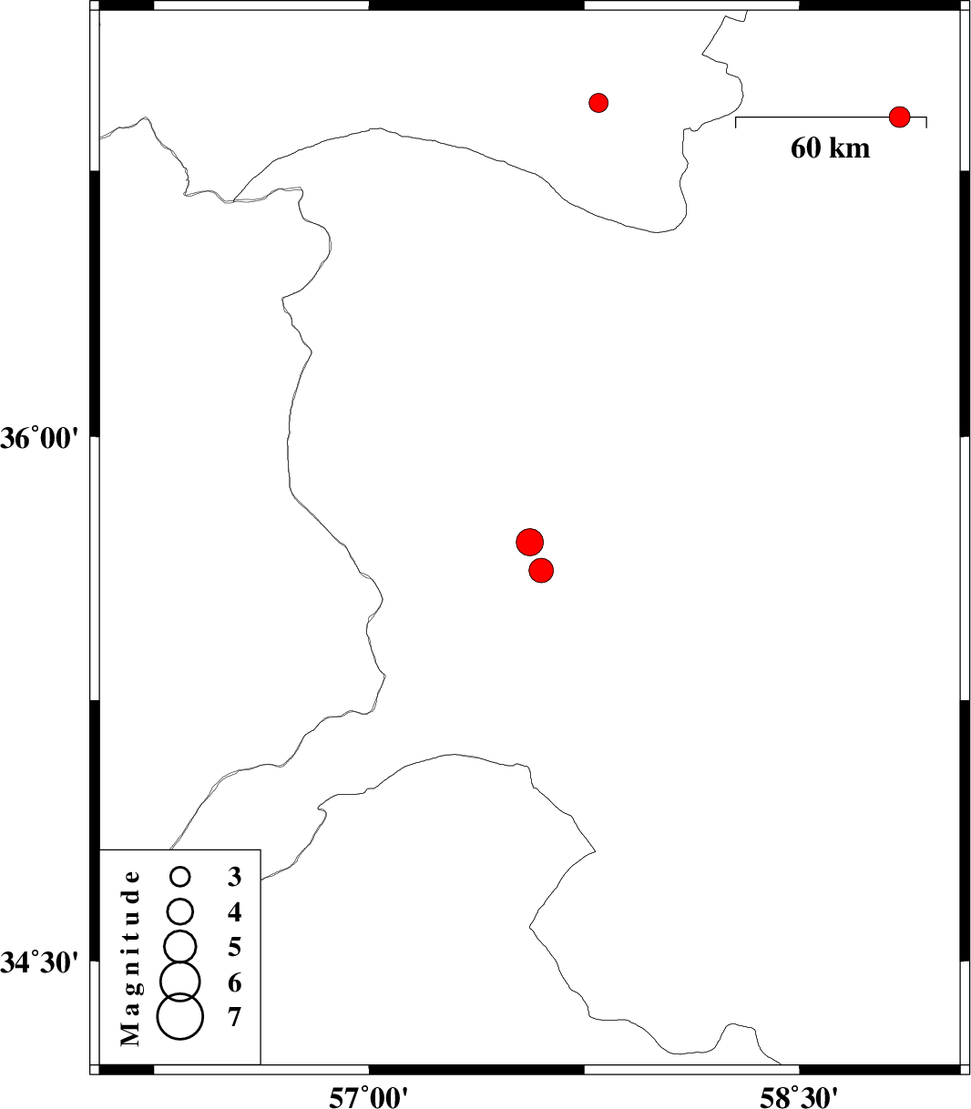 | 2010/02/06 | 00:49:07.9 | 04:19:07.9 | 36.94 | 57.8 | 15 | ML:2.9 | 30 km South-East of Esfarayen, Khorasan(north) Province | ||