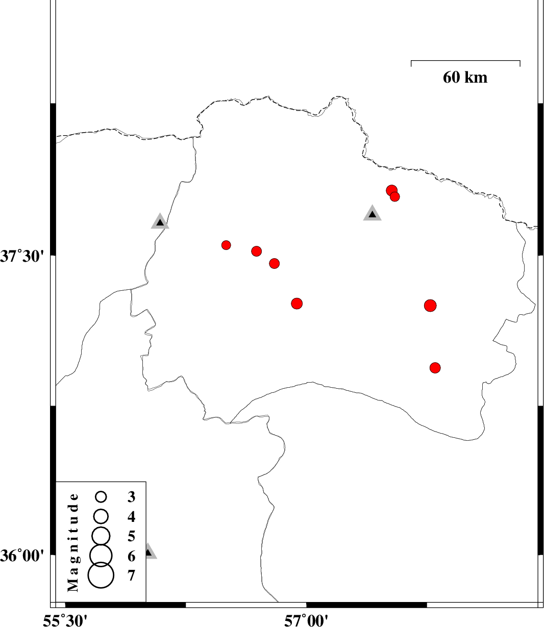 | 2010/02/14 | 02:19:42.0 | 05:49:42.0 | 37.79 | 57.55 | 6 | ML:2.7 | 39 km North-East of Bojnurd, Khorasan(north) Province | ||