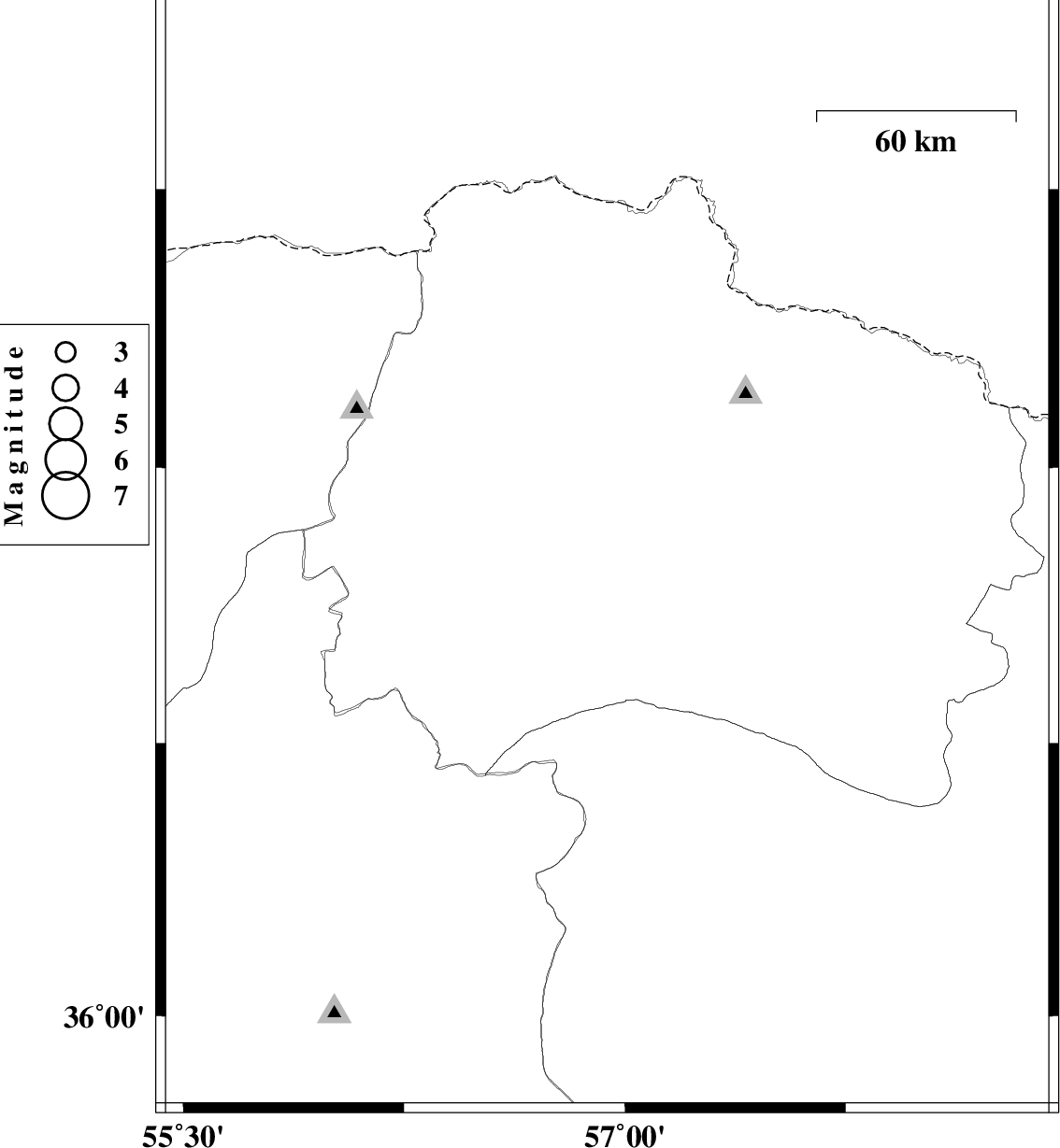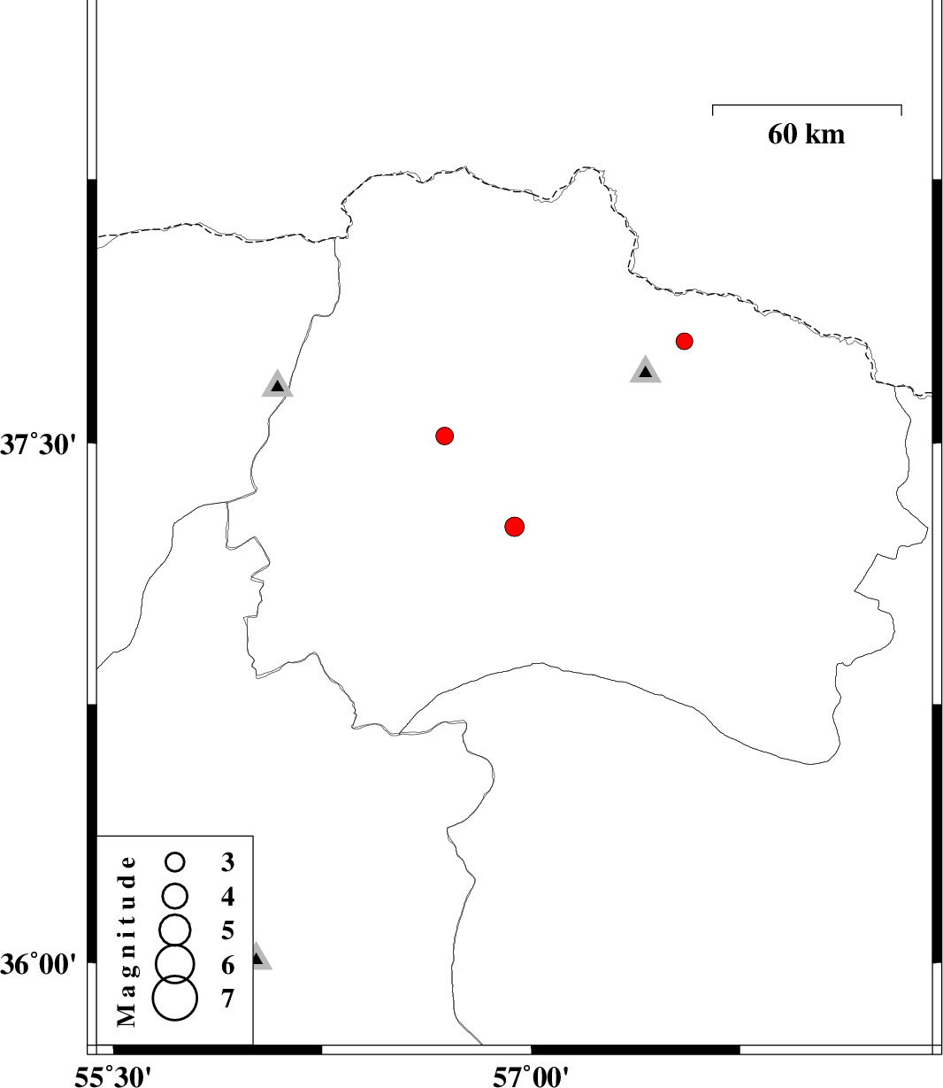 | 2010/02/14 | 02:19:42.0 | 05:49:42.0 | 37.79 | 57.55 | 6 | ML:2.7 | 39 km North-East of Bojnurd, Khorasan(north) Province |