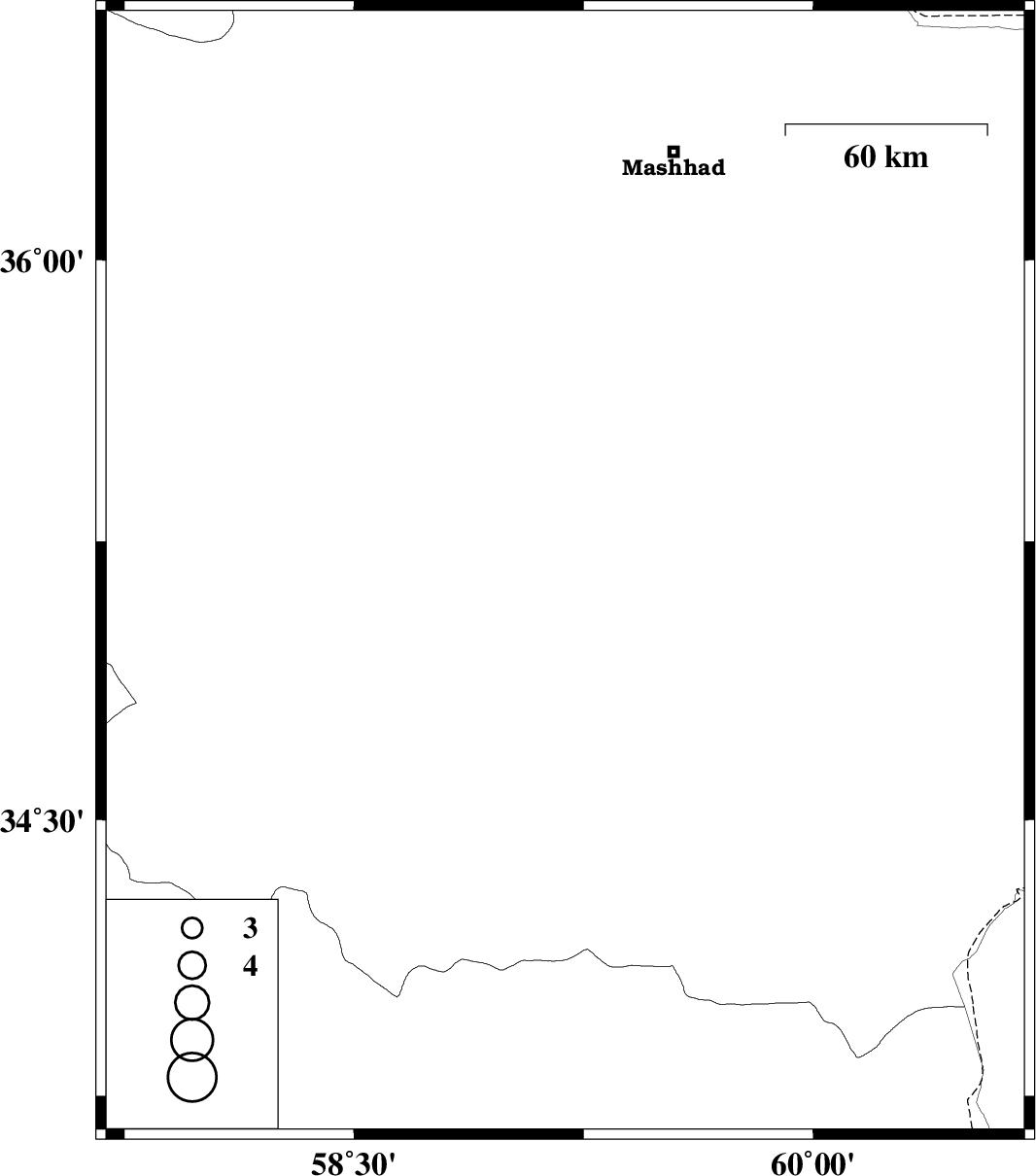 | 2010/02/21 | 16:00:07.9 | 19:30:07.9 | 35.16 | 59.19 | 15 | ML:3.1 | Khorasan(center) Province, 13 km South of Torbat-e heydariyeh |