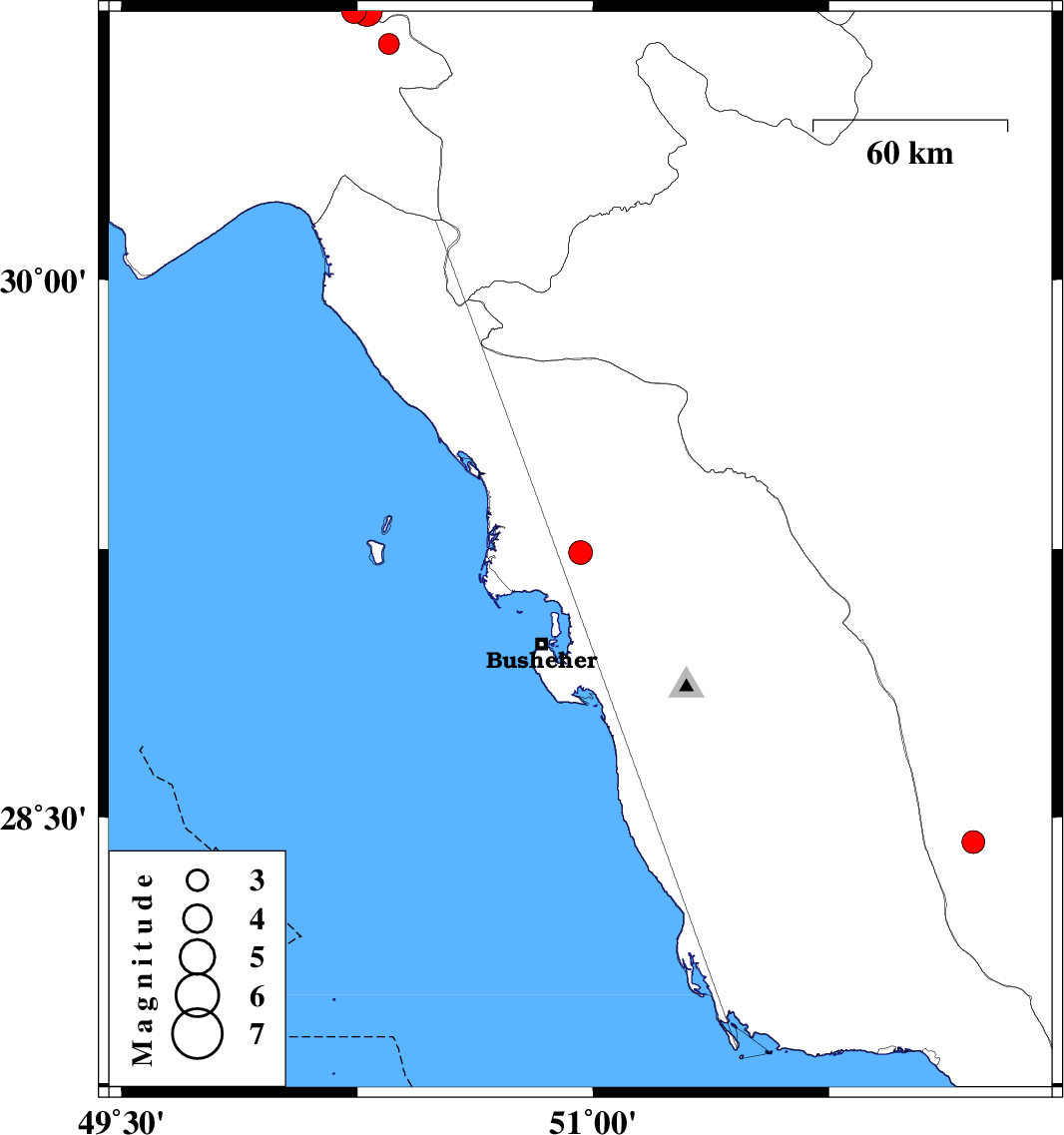 | 2010/02/25 | 15:41:50.0 | 19:11:50.0 | 29.24 | 50.96 | 15 | ML:3.4 | Bushehr Province, 24 km West of Borazjan | ||