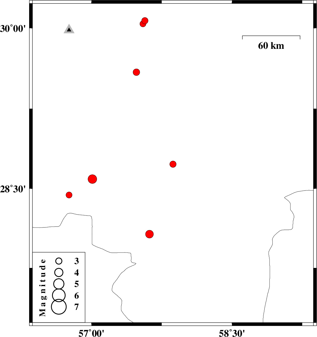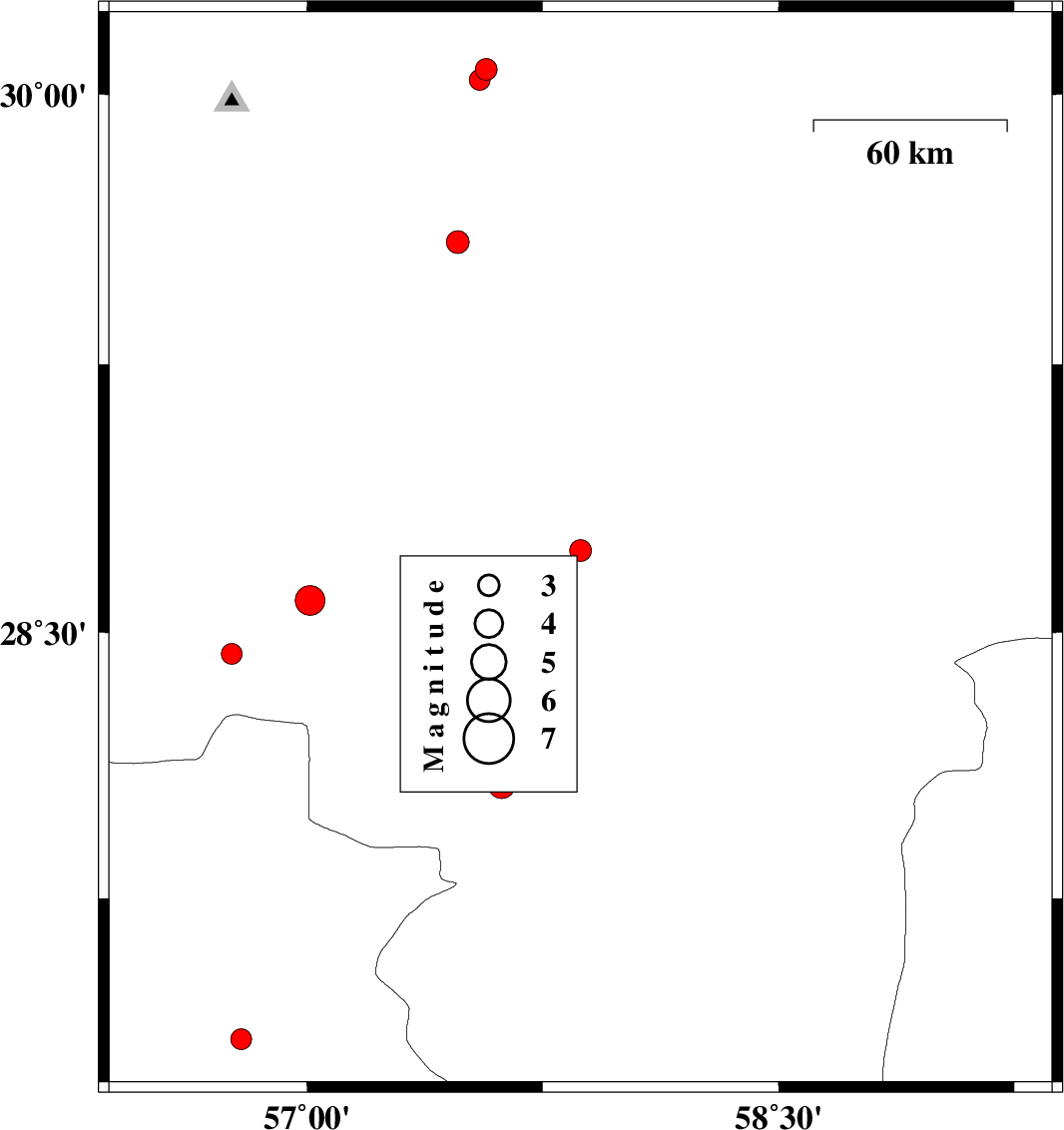 | 2010/01/29 | 20:50:19.5 | 00:20:19.5 | 28.07 | 57.62 | 15 | ML:3.8 | 14 km North of Kahnuj, Kerman Province |