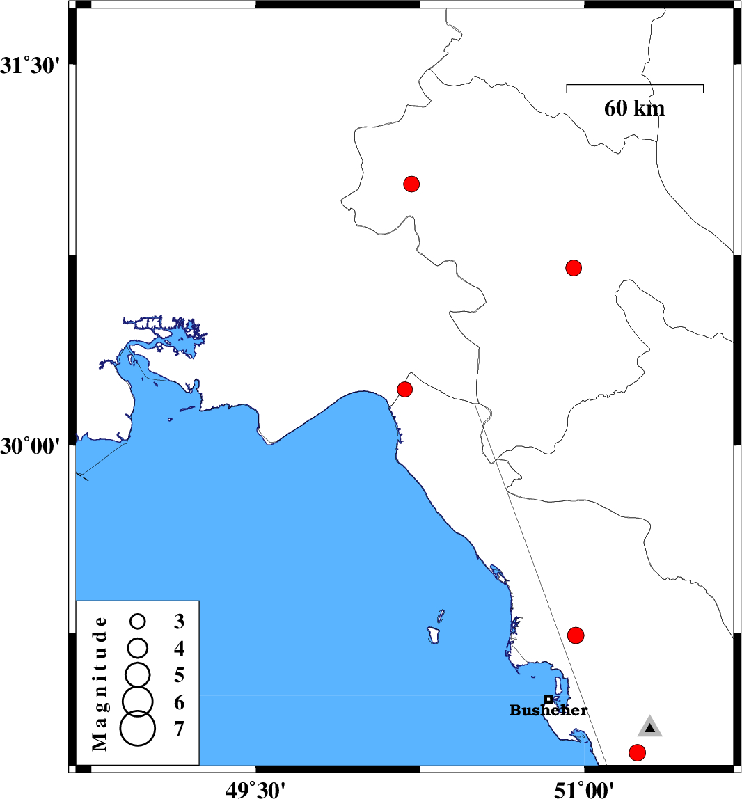 | 2010/02/25 | 15:41:50.0 | 19:11:50.0 | 29.24 | 50.96 | 15 | ML:3.4 | Bushehr Province, 24 km West of Borazjan | ||