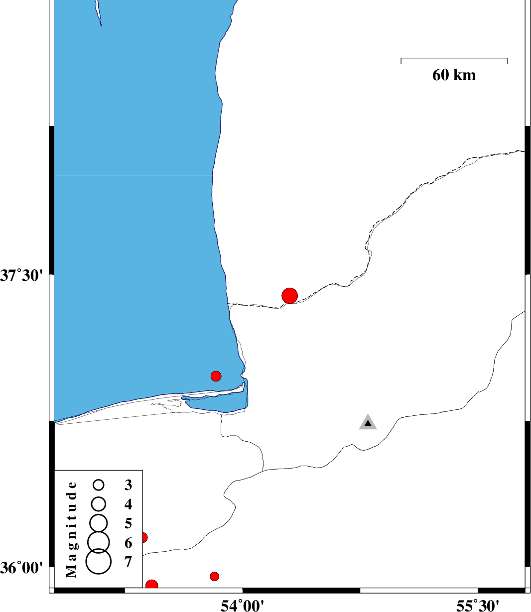 | 2010/02/22 | 19:54:28.1 | 23:24:28.1 | 36.98 | 53.83 | 15 | ML:3 | Caspian Sea, 24 km West of Bandar-e torkaman | ||