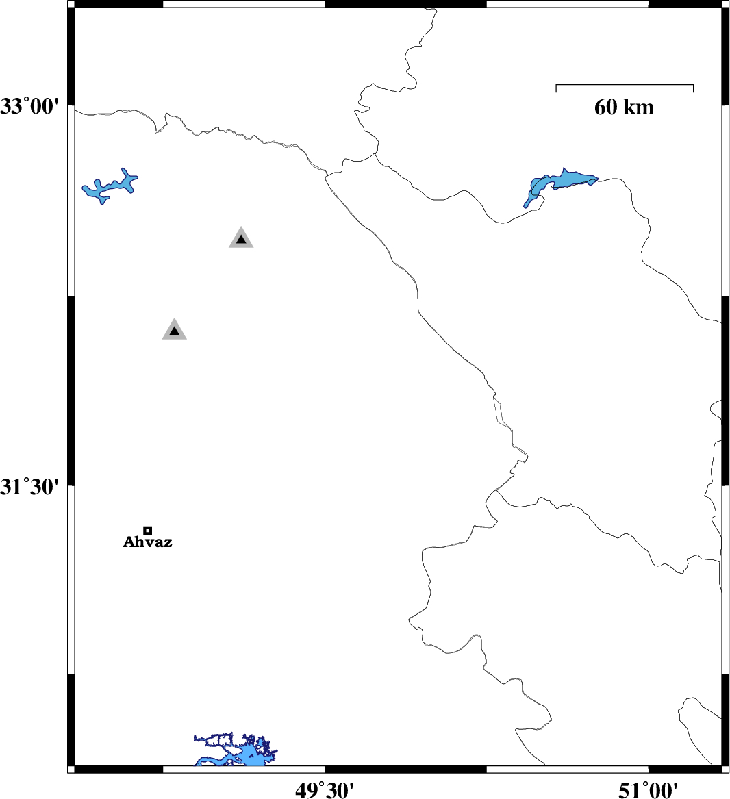2010/02/23 | 19:23:24.5 | 22:53:24.5 | 32.58 | 48.46 | 41 | ML:2.5 | Khoozestan Province, 16 km North-East of Andimeshk | ||