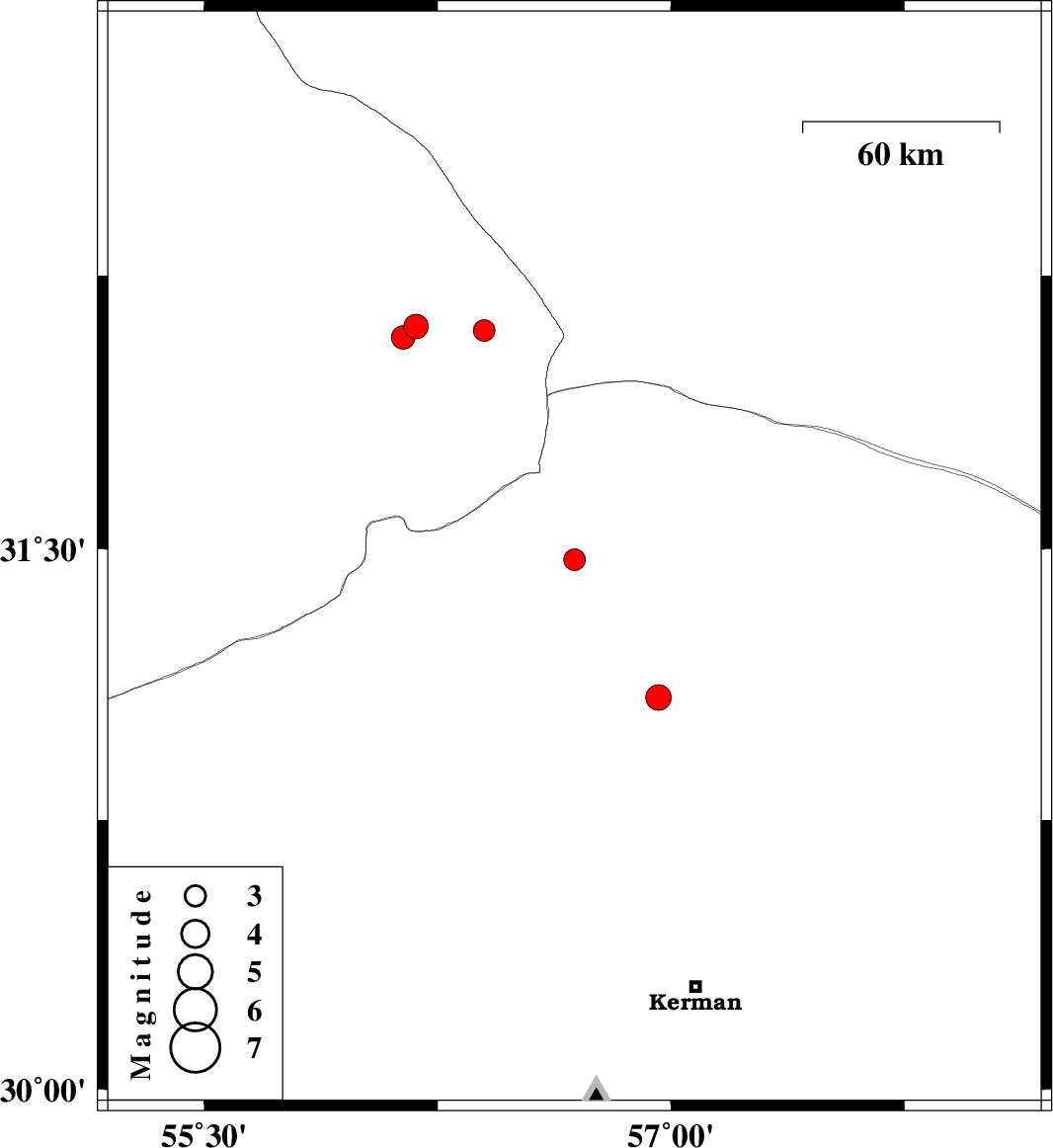 | 2010/03/04 | 15:39:56.3 | 19:09:56.3 | 31.47 | 56.69 | 38 | ML:3.1 | Kerman Province, 26 km North-West of Ravar | ||