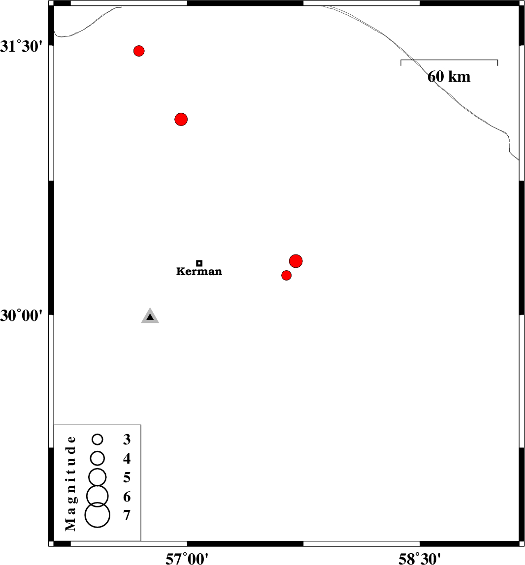| 2010/03/08 | 16:39:35.2 | 20:09:35.2 | 30.3 | 57.7 | 14 | ML:3.8 | Kerman Province, 60 km East of Kerman | ||