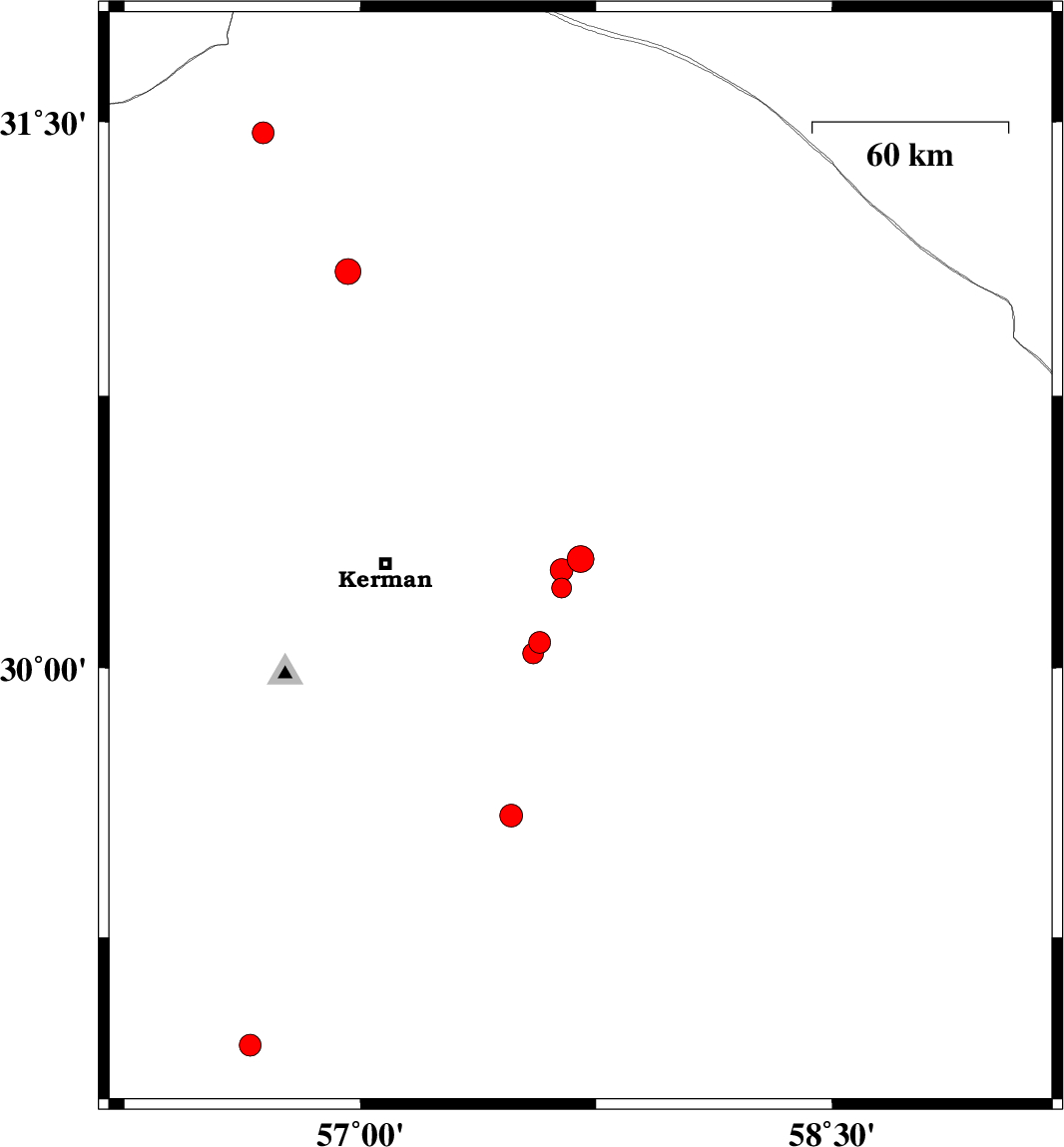 | 2010/03/08 | 16:39:35.2 | 20:09:35.2 | 30.3 | 57.7 | 14 | ML:3.8 | Kerman Province, 60 km East of Kerman | ||