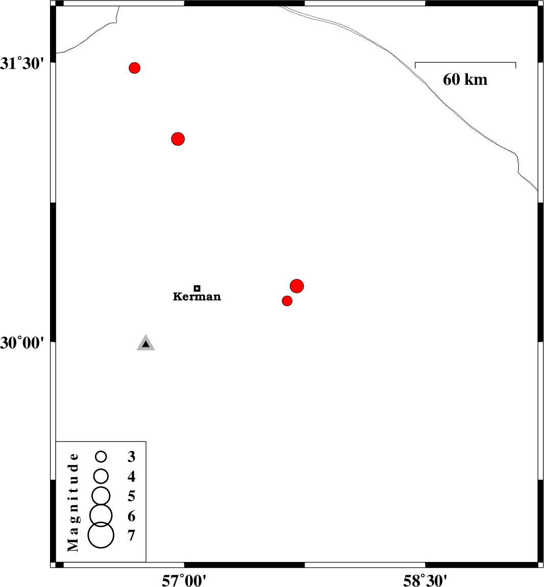 | 2010/03/08 | 16:39:35.2 | 20:09:35.2 | 30.3 | 57.7 | 14 | ML:3.8 | Kerman Province, 60 km East of Kerman | ||