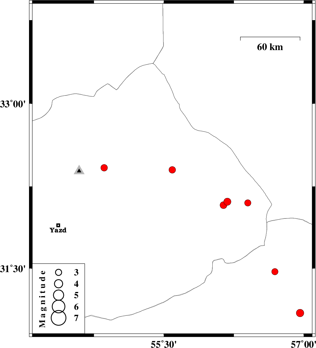 | 2010/02/25 | 04:34:49.3 | 08:04:49.3 | 32.08 | 56.14 | 14 | ML:3.4 | Yazd Province, 88 km North-East of Bafq |