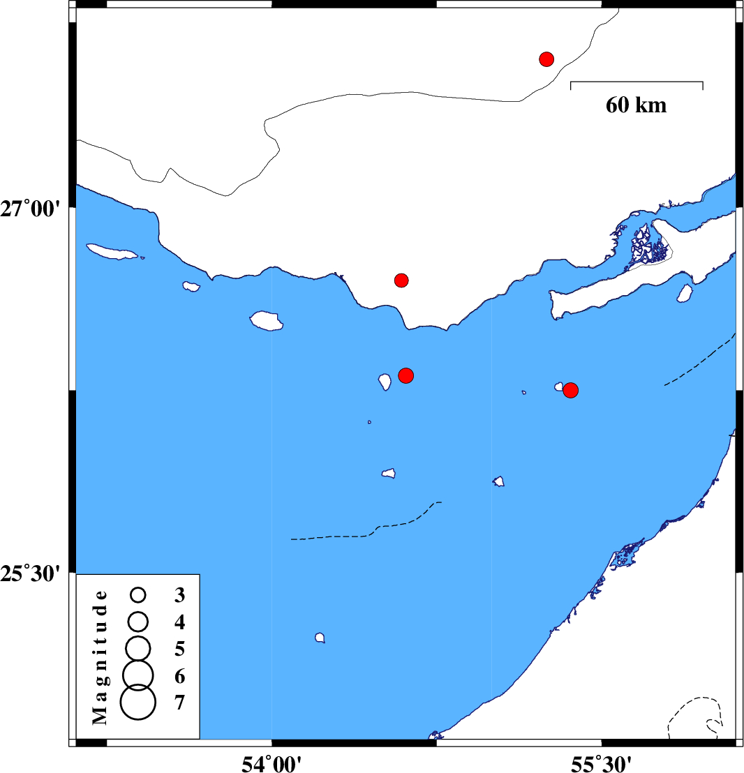| 2010/03/14 | 15:50:59.8 | 19:20:59.8 | 26.25 | 55.36 | 18 | ML:3.1 | Persian Gulf, 53 km North-East of Abu Musa | ||