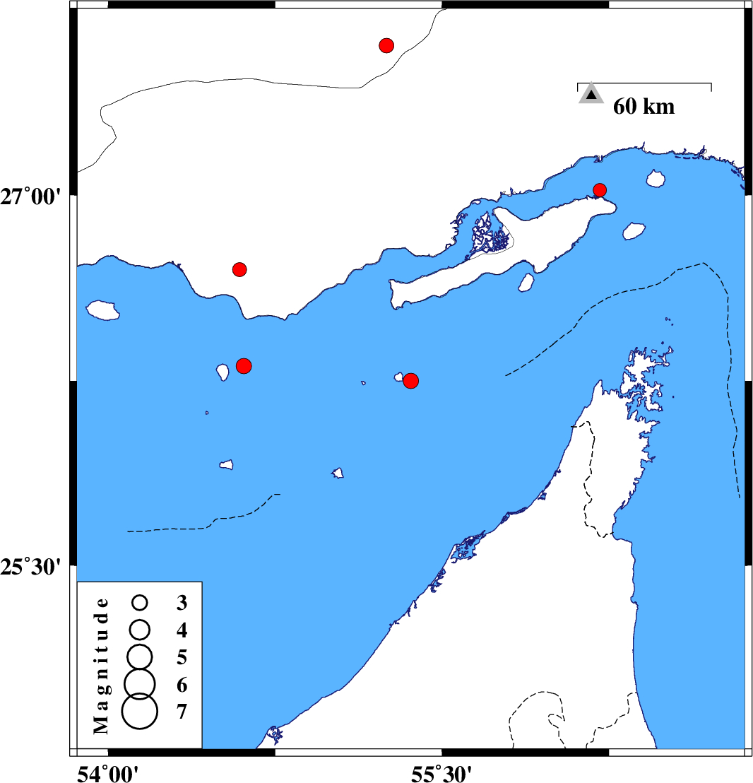 | 2010/03/14 | 15:50:59.8 | 19:20:59.8 | 26.25 | 55.36 | 18 | ML:3.1 | Persian Gulf, 53 km North-East of Abu Musa | ||