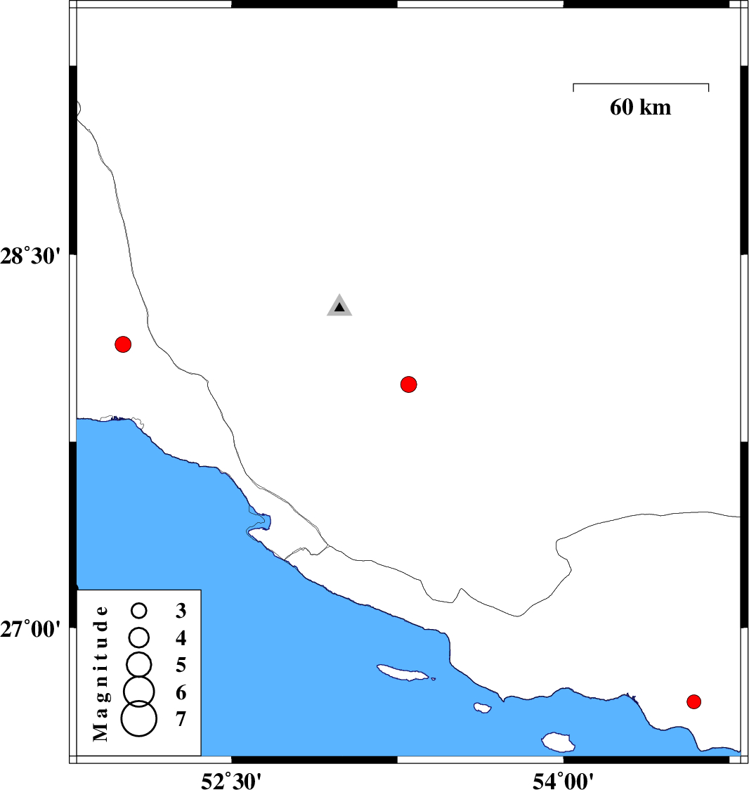 | 2010/03/16 | 18:39:15.6 | 22:09:15.6 | 27.98 | 53.3 | 14 | ML:3.2 | Fars Province, 60 km South-East of Qir va Karzin | ||