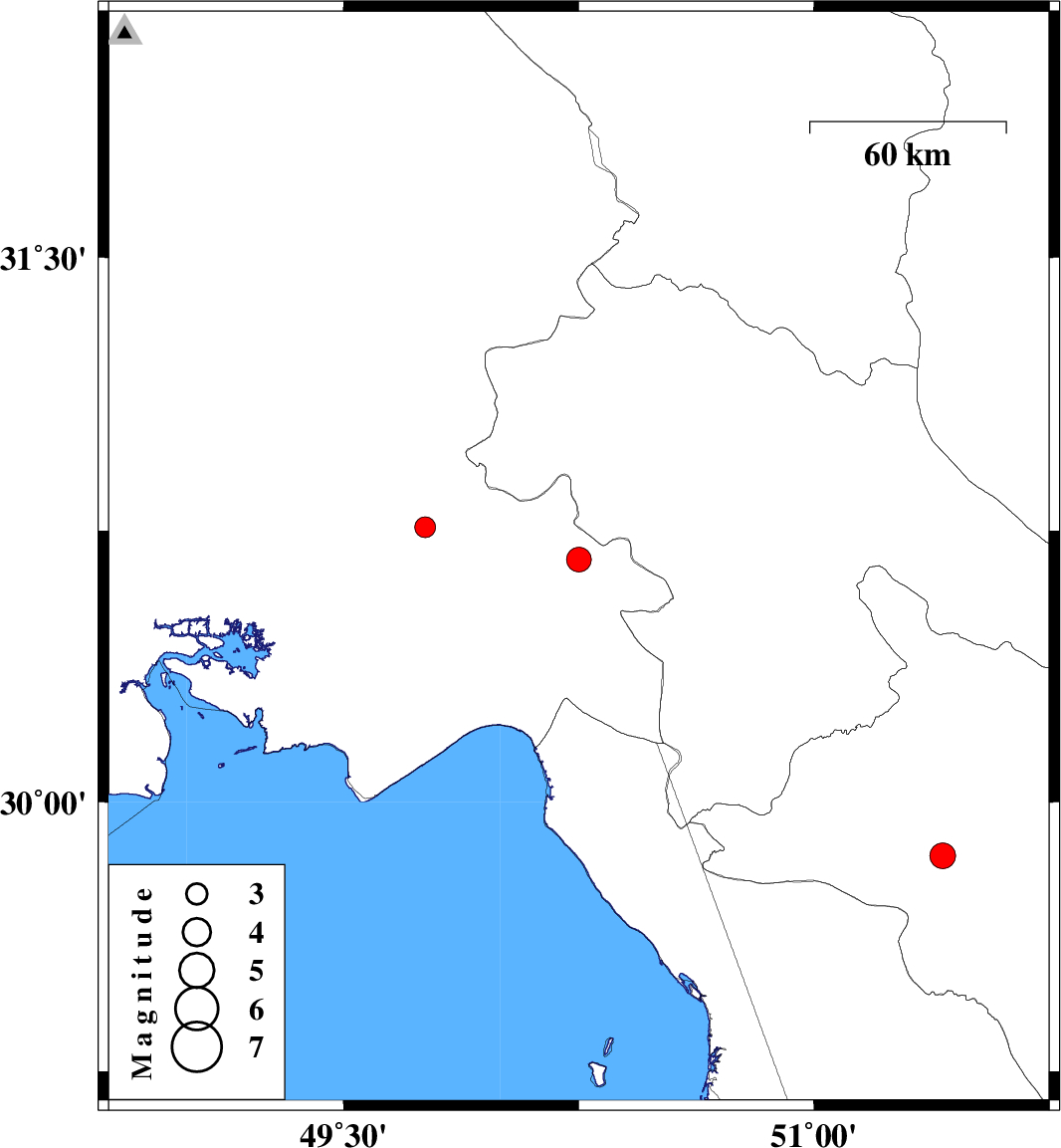 | 2010/03/11 | 18:31:07.7 | 22:01:07.7 | 30.76 | 49.76 | 45 | ML:3 | Khoozestan Province, 5 km Omidiyeh |