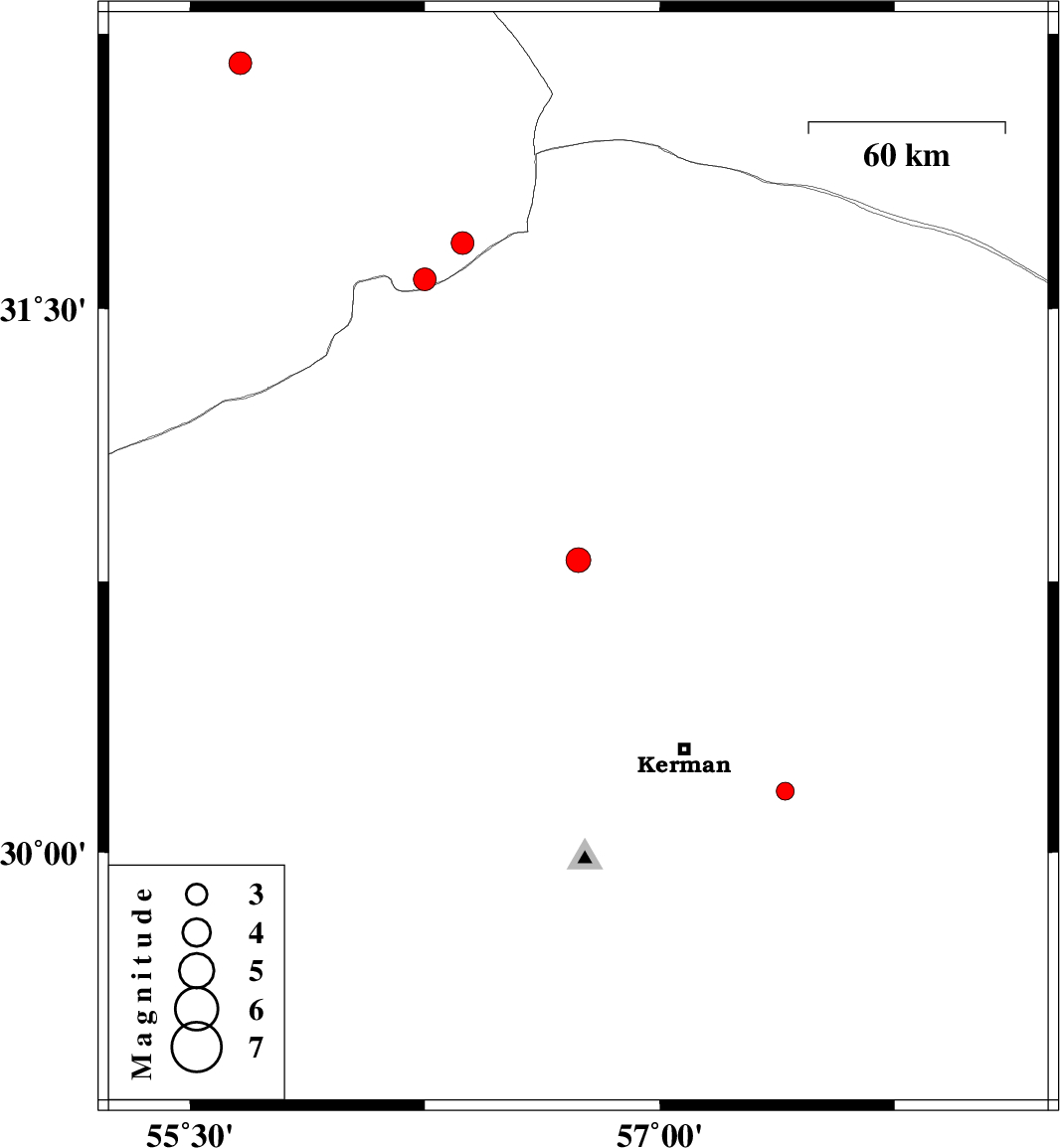 | 2010/03/20 | 06:02:50.3 | 09:32:50.3 | 30.17 | 57.4 | 8 | ML:2.6 | Kerman Province, 34 km South-East of Kerman | ||