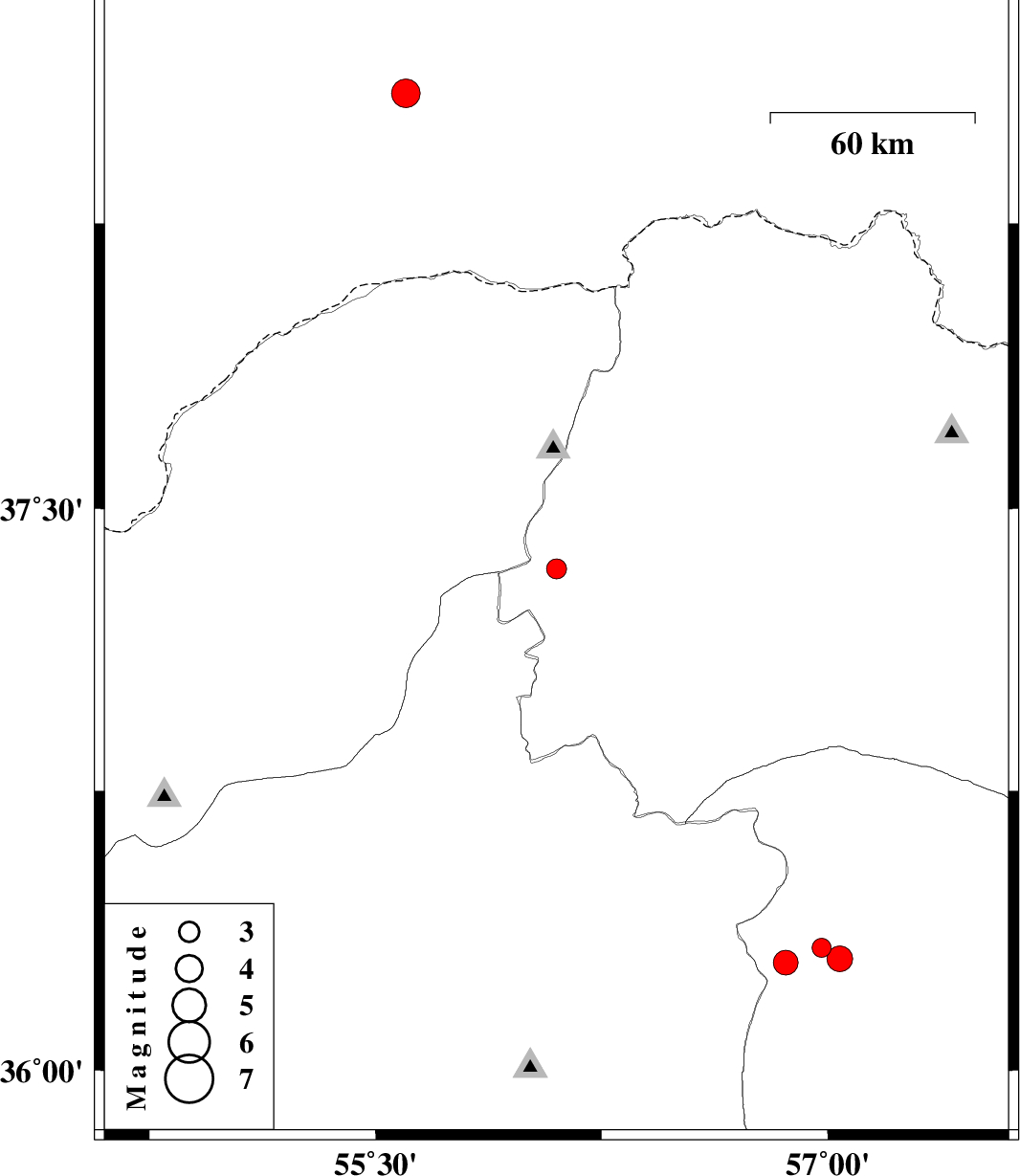 | 2010/03/24 | 23:02:49.2 | 03:32:49.2 | 36.33 | 56.98 | 46 | ML:2.8 | Khorasan(center) Province, 64 km North-West of Sabzevar | ||