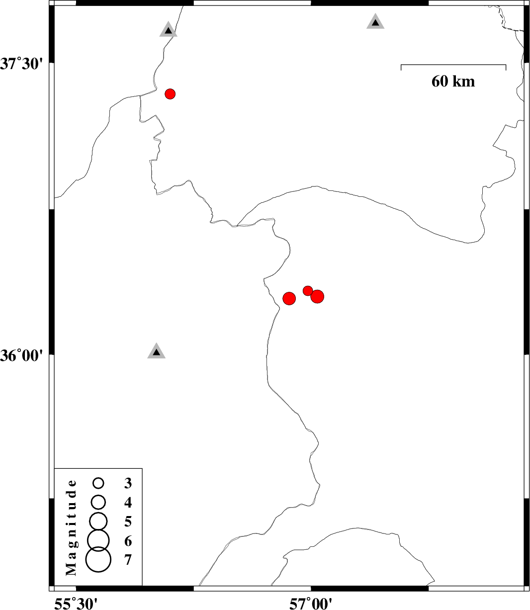 | 2010/03/19 | 15:03:52.2 | 18:33:52.2 | 36.3 | 57.04 | 14 | ML:3.8 | Khorasan(center) Province, 58 km West of Sabzevar |