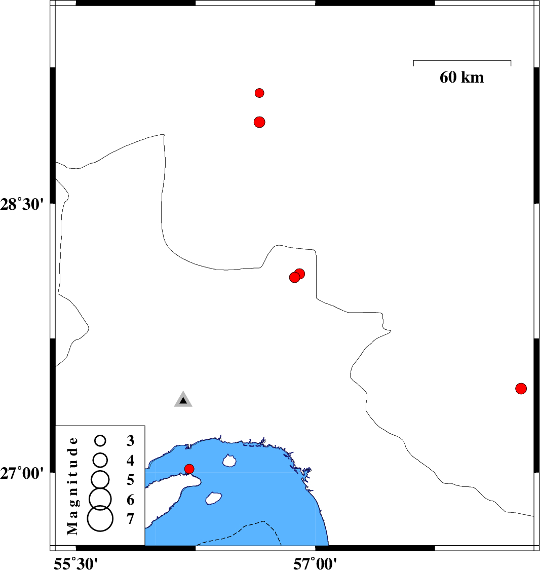 | 2010/02/26 | 00:17:58.8 | 03:47:58.8 | 28.11 | 56.9 | 28 | ML:3 | Hormozgan Province, 80 km North-West of Kahnuj |