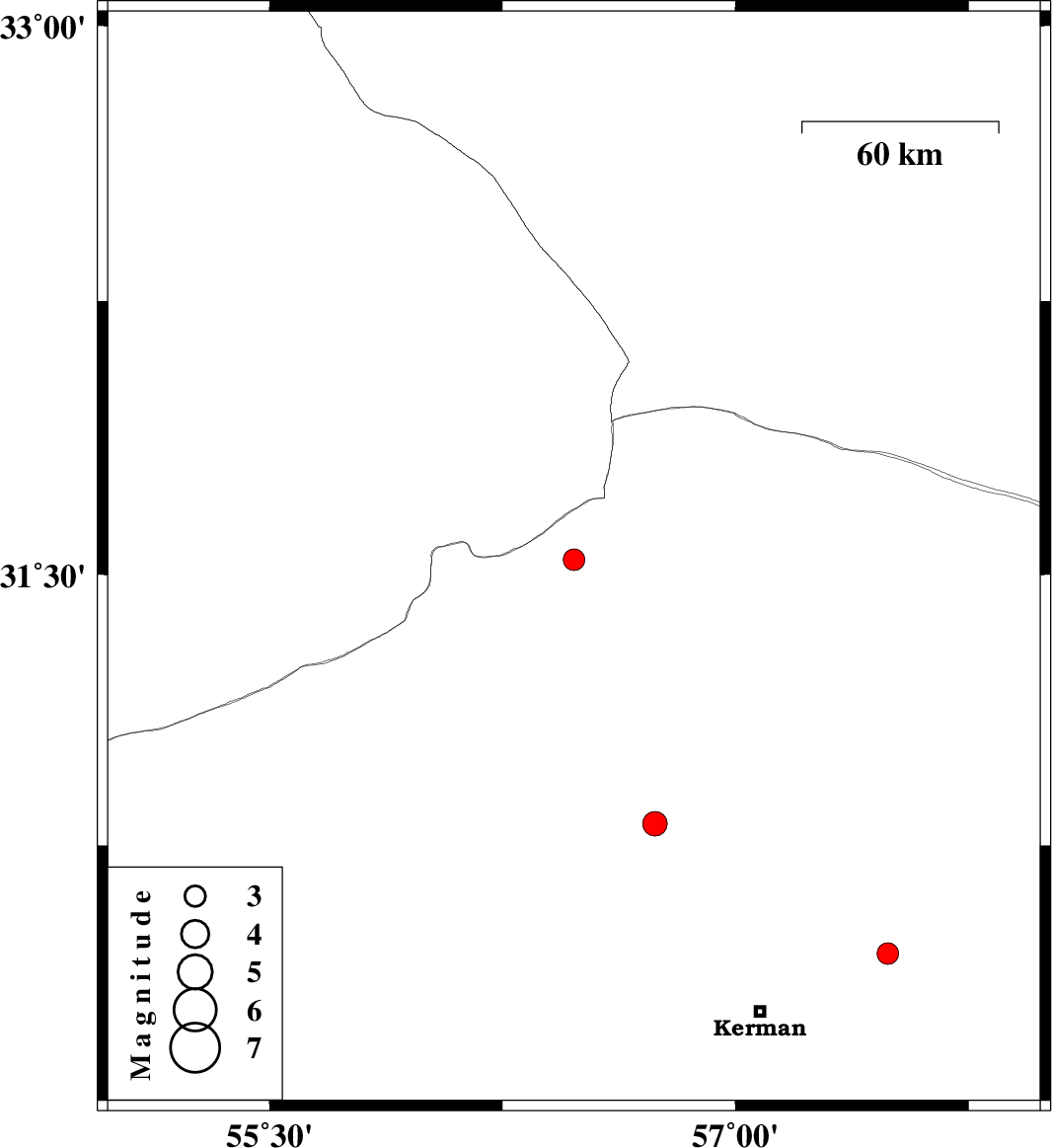 | 2010/03/25 | 01:49:38.1 | 06:19:38.1 | 30.45 | 57.49 | 6 | ML:3.1 | Kerman Province, 43 km North-East of Kerman | ||