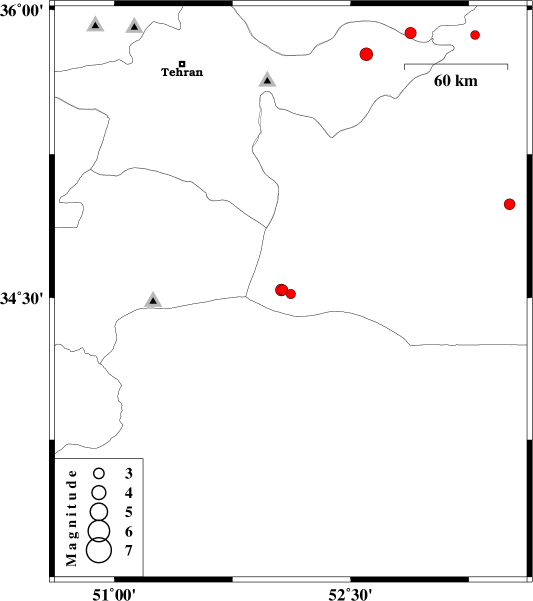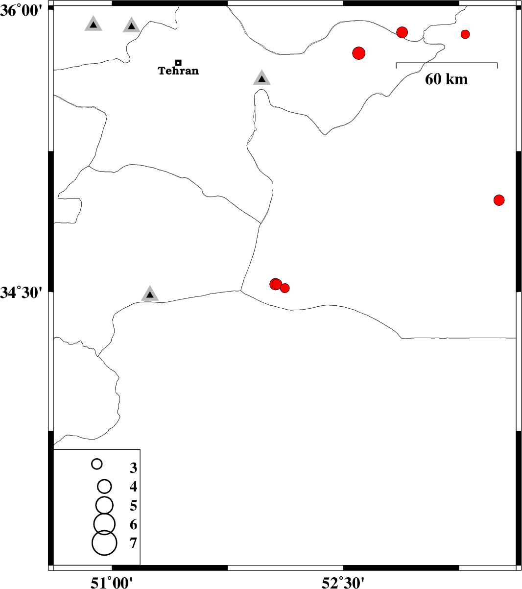 | 2009/07/03 | 16:10:06.2 | 20:40:06.2 | 34.54 | 52.07 | 34 | ML:2.9 | Semnan Province, 79 km South-West of Garmsar | ||