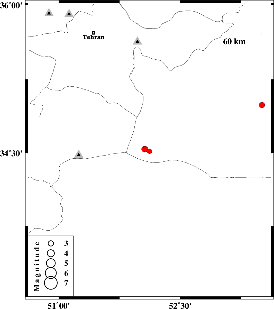 | 2009/07/03 | 16:10:06.2 | 20:40:06.2 | 34.54 | 52.07 | 34 | ML:2.9 | Semnan Province, 79 km South-West of Garmsar | ||