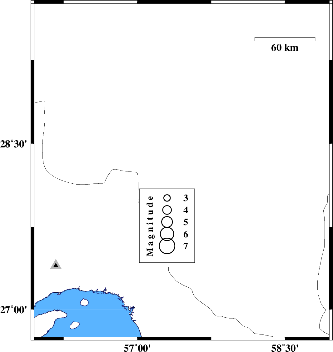 | 2009/07/05 | 21:51:26.6 | 02:21:26.6 | 28.25 | 57.45 | 14 | ML:3.2 | Kerman Province, 41 km North-West of Kahnuj |