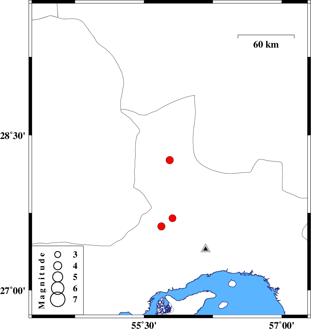 | 2009/07/06 | 01:03:25.8 | 05:33:25.8 | 28.26 | 55.78 | 32 | ML:3.6 | Hormozgan Province, 13 km West of Hajiabad | ||