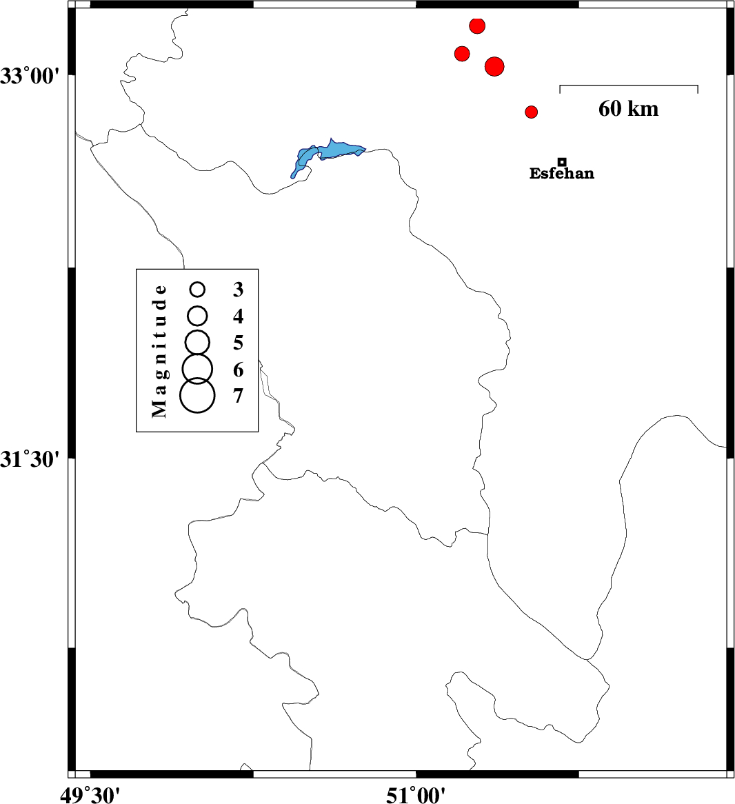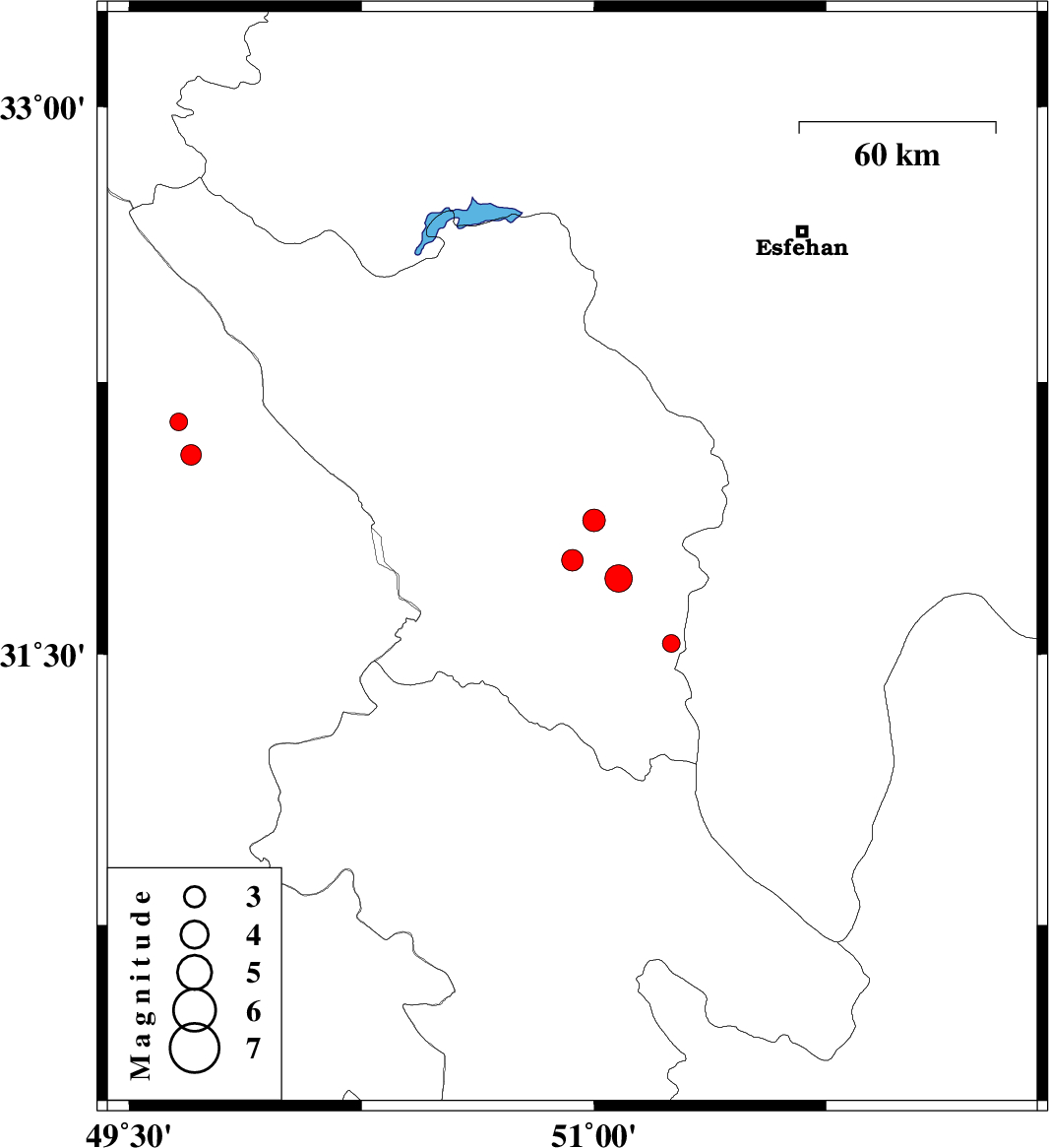 | 2009/06/11 | 19:54:06.2 | 00:24:06.2 | 31.53 | 51.25 | 14 | ML:2.6 | 33 km North-West of Semirom, Esfahan Province |