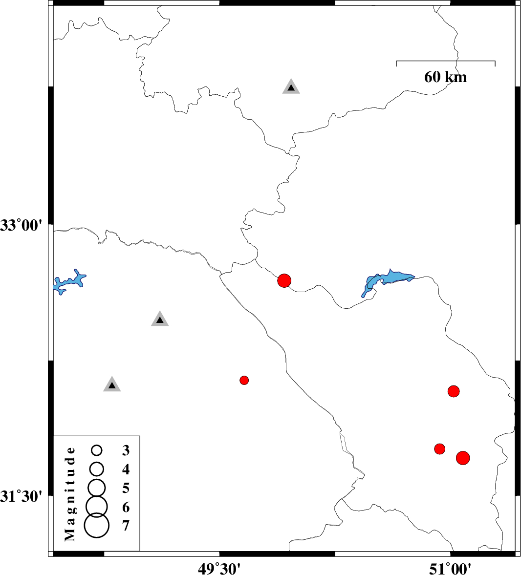 | 2009/07/10 | 04:05:12.4 | 08:35:12.4 | 32.69 | 49.92 | 14 | ML:4 | Esfahan Province, 31 km North-West of Chelgard | ||
