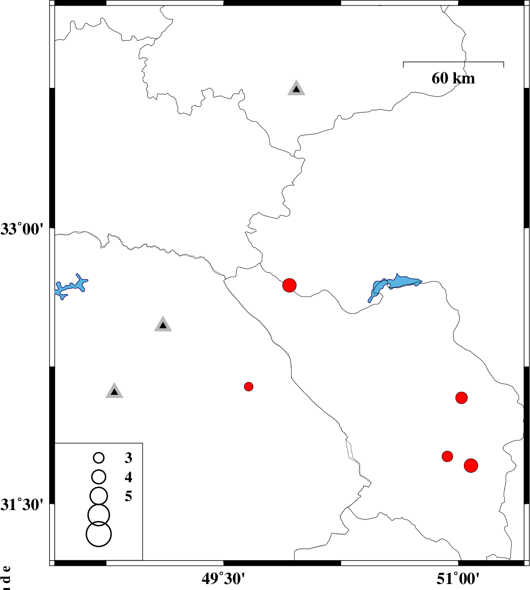 | 2009/07/08 | 14:15:21.6 | 18:45:21.6 | 31.76 | 50.93 | 16 | ML:3.1 | Chaharmahal Bakhtiari Province, 31 km North-East of Lordegan | ||