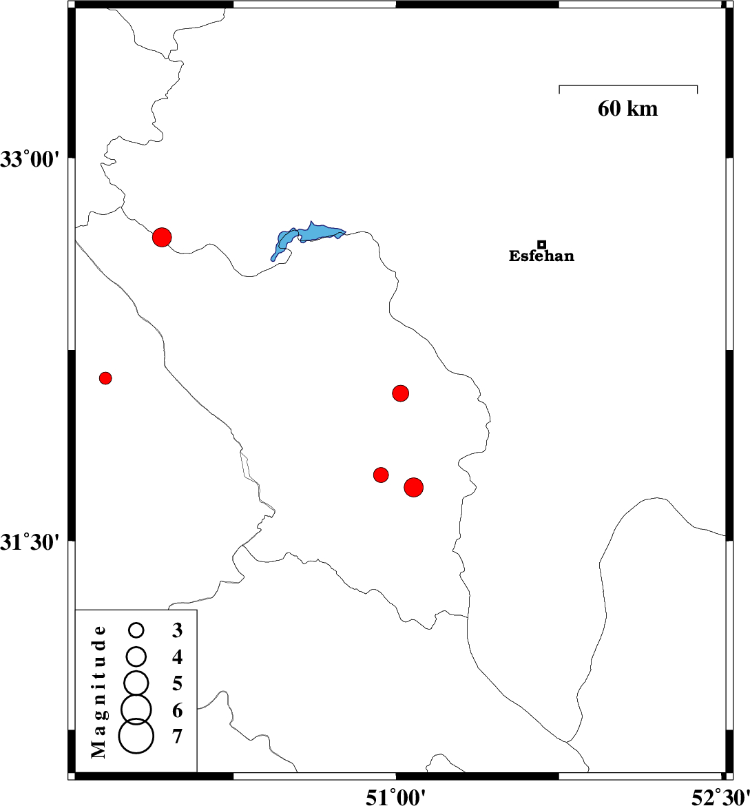 | 2009/07/10 | 04:05:12.4 | 08:35:12.4 | 32.69 | 49.92 | 14 | ML:4 | Esfahan Province, 31 km North-West of Chelgard | ||