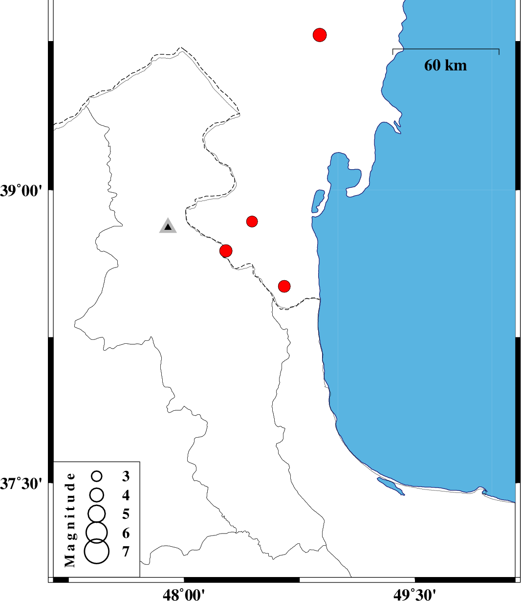 | 2009/07/01 | 22:12:11.7 | 02:42:11.7 | 39.78 | 48.88 | 30 | ML:4 | Azerbaijan, 65 km North-East of Bileh Savar | ||