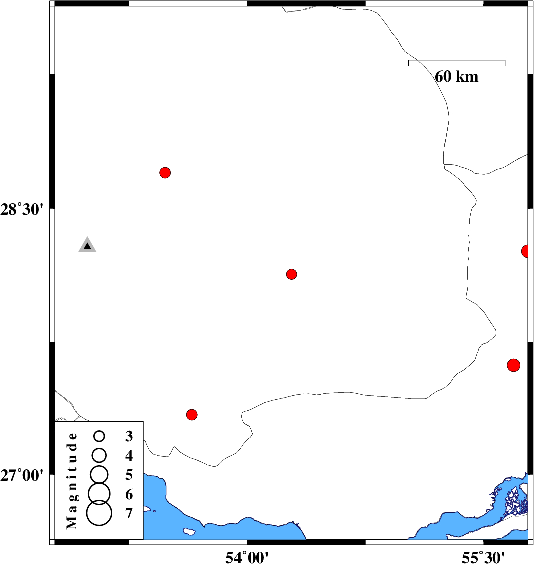 | 2009/07/12 | 19:40:40.1 | 00:10:40.1 | 28.13 | 54.28 | 40 | ML:3 | Fars Province, 51 km North of Lar | ||