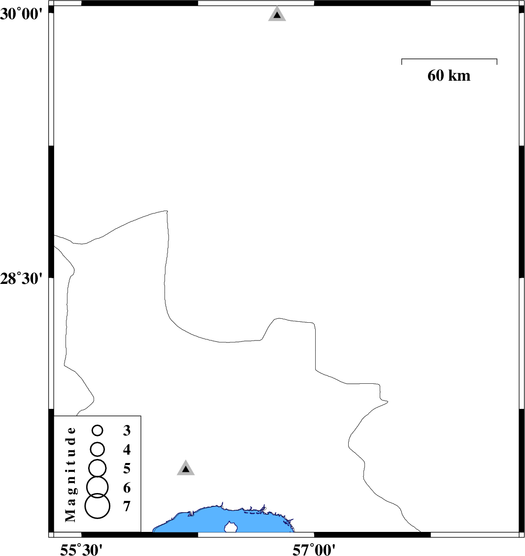 | 2009/07/16 | 05:12:44.6 | 09:42:44.6 | 28.54 | 56.82 | 15 | ML:2.8 | Kerman Province, 80 km South-East of Baft |