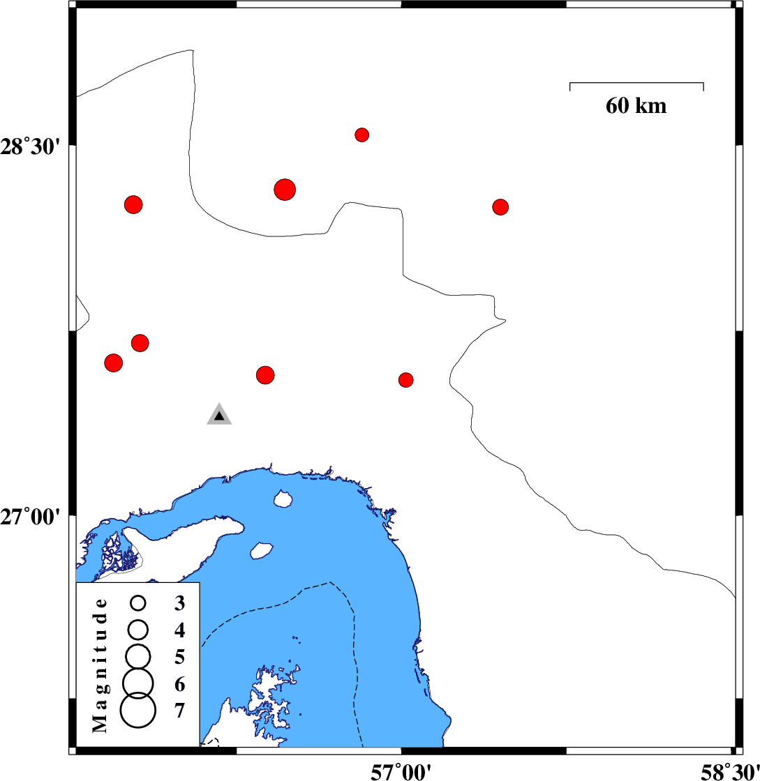 | 2009/07/19 | 07:51:10.8 | 12:21:10.8 | 27.55 | 57.02 | 14 | ML:3 | Hormozgan Province, 26 km North-West of Dehbarez | ||
