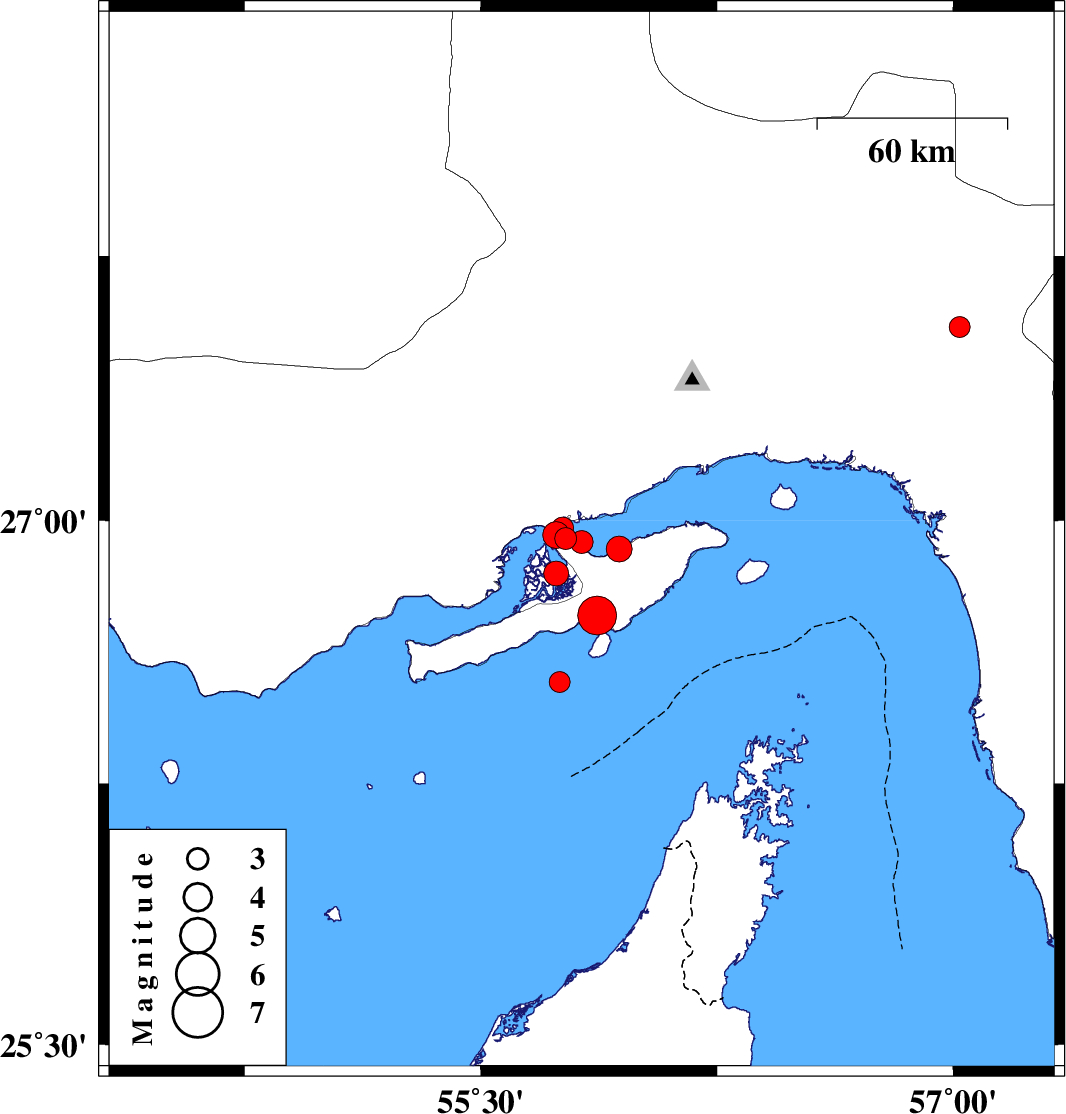 | 2009/07/22 | 09:10:06.1 | 13:40:06.1 | 26.95 | 55.77 | 6 | ML:3.1 | Persian Gulf, 49 km West of Qeshm | ||