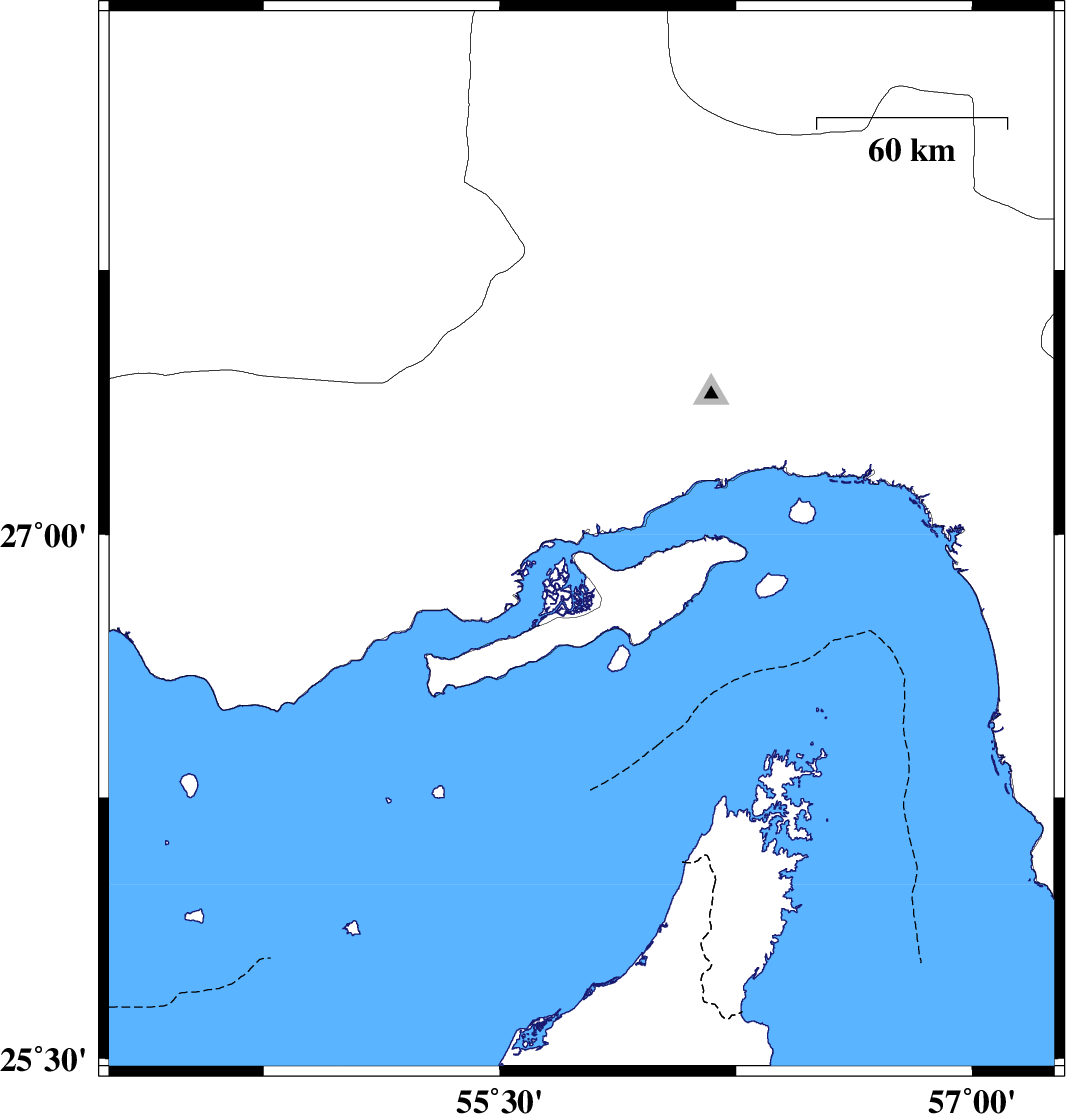 | 2009/07/22 | 17:44:55.8 | 22:14:55.8 | 26.92 | 55.94 | 28 | ML:3.7 | Persian Gulf, 33 km West of Qeshm | ||