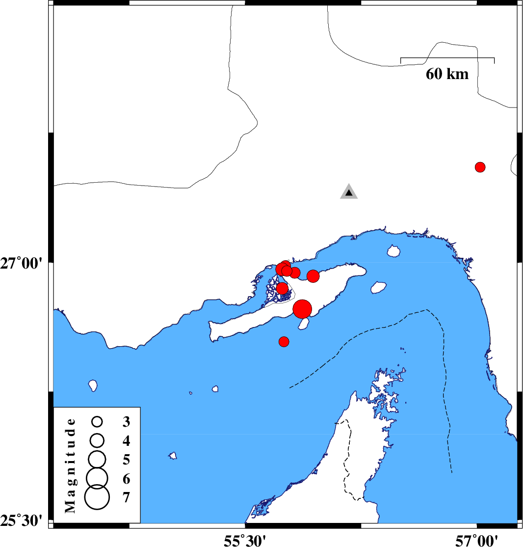| 2009/07/22 | 09:10:06.1 | 13:40:06.1 | 26.95 | 55.77 | 6 | ML:3.1 | Persian Gulf, 49 km West of Qeshm | ||