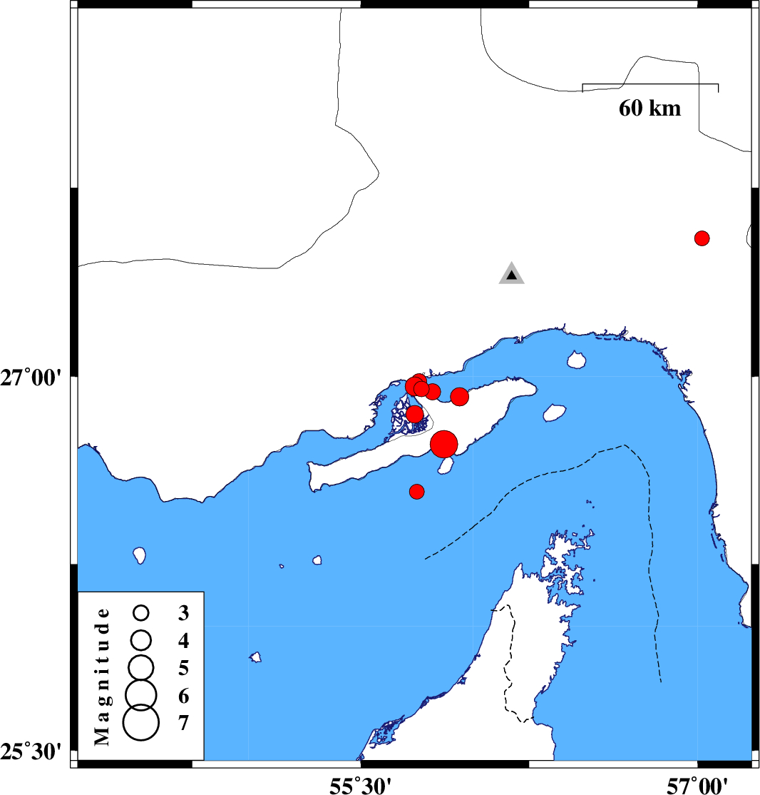 | 2009/07/22 | 09:10:06.1 | 13:40:06.1 | 26.95 | 55.77 | 6 | ML:3.1 | Persian Gulf, 49 km West of Qeshm | ||