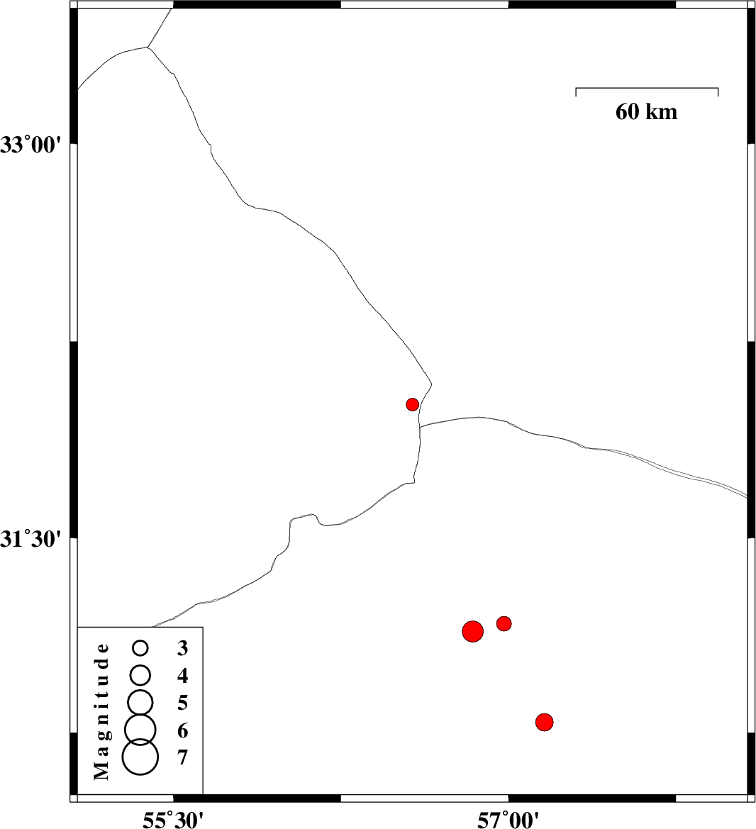 | 2009/06/26 | 15:49:46.4 | 20:19:46.4 | 31.14 | 56.84 | 15 | ML:4.2 | 13 km South of Ravar, Kerman Province |