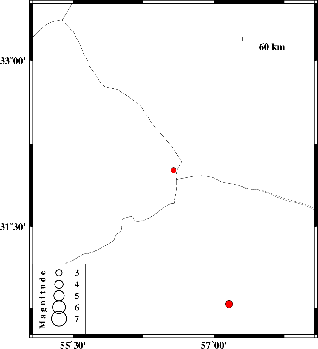 | 2009/07/18 | 14:24:31.9 | 18:54:31.9 | 30.79 | 57.16 | 15 | ML:3.5 | Kerman Province, 56 km North of Kerman |