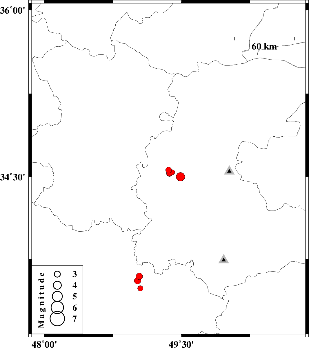 | 2009/07/25 | 20:37:33.1 | 01:07:33.1 | 33.59 | 49.04 | 15 | ML:3.2 | Lorestan Province, 12 km North of Dorud | ||