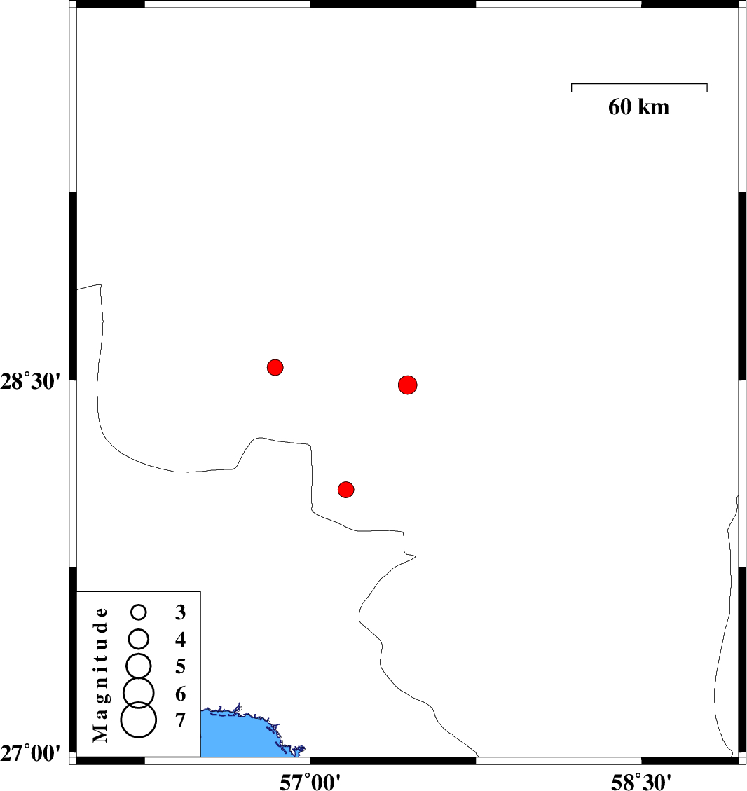 | 2009/07/25 | 06:48:52.2 | 11:18:52.2 | 28.06 | 57.16 | 46 | ML:3.2 | Kerman Province, 53 km North-West of Kahnuj |